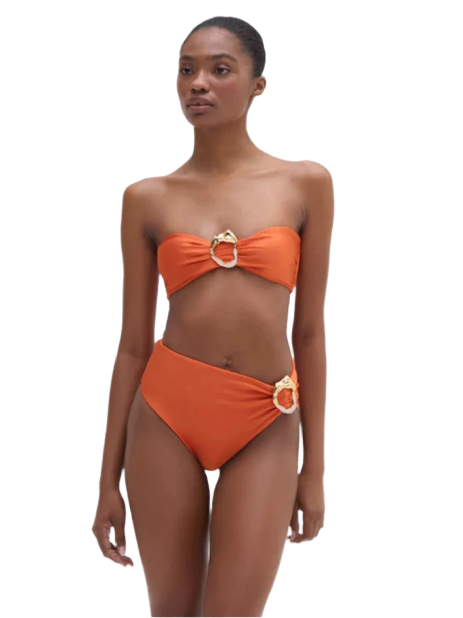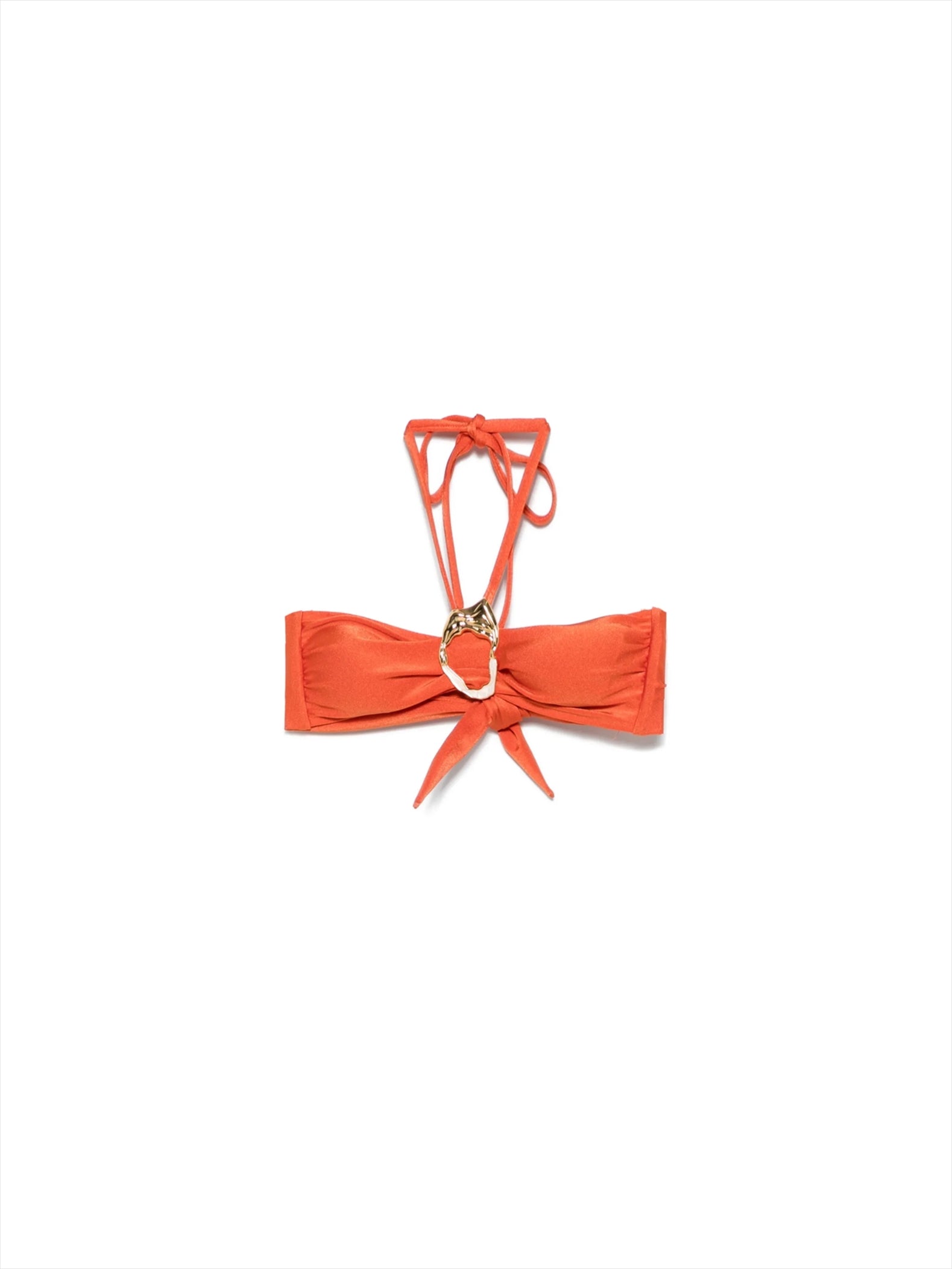 Elevate your beach look with this sleek bandeau bikini top. Crafted from stretch lycra fabric, it features a subtle center ring detail and adjustable neck tie closure. An optional halter neck strap adds a chic touch. Sleek, versatile, and comfortable, this bandeau top is perfect for a day by the pool or a night out.