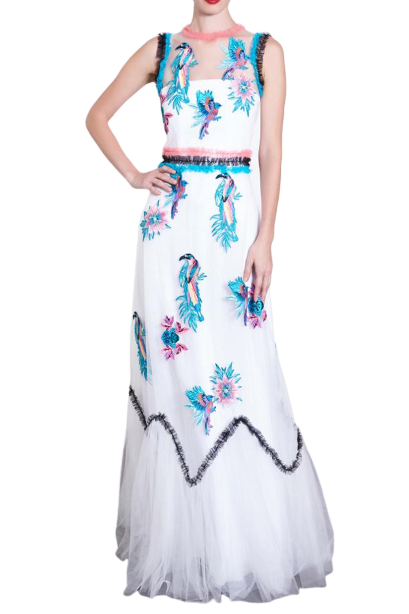 Elevate your evening attire with our stunning Birdy Gown. The ethereal white tulle showcases vibrant embroidered birds and delicate floral motifs, symbolizing freedom and grace. The playful fringes in blush pink and bold black add a modern contrast to the sheer neckline and waistline. With a scalloped black fringe trim and floor-length finish, this gown is perfect for elegant soirées.