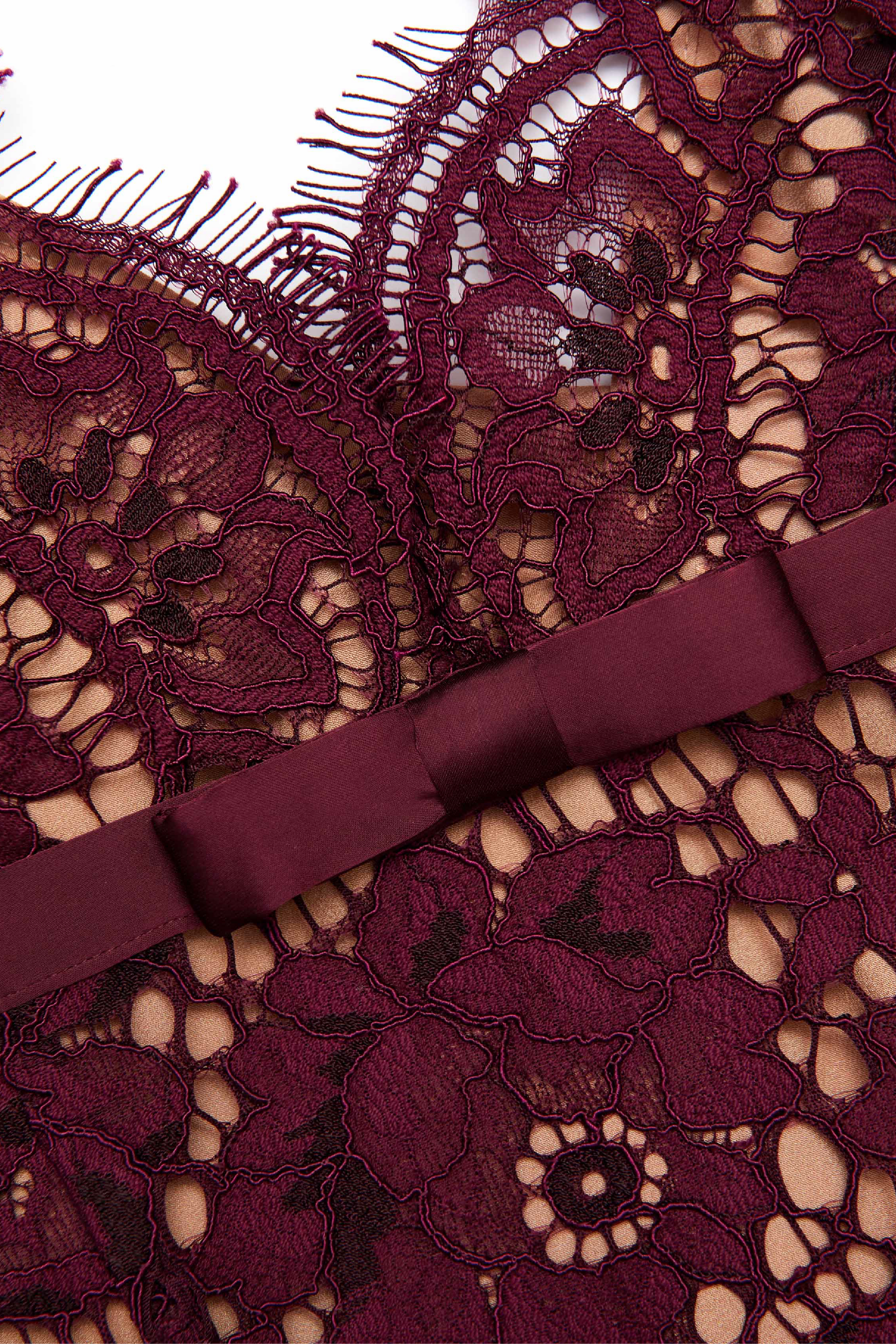 Channel timeless elegance with this burgundy floral lace midi dress, featuring a flattering V-neckline adorned with a delicate bow motif. The fit-and-flare silhouette enhances your figure, while the concealed back zip ensures a seamless finish. Designed with minimal stretch and a removable cami lining, this dress offers both comfort and versatility. Perfect for sophisticated occasions, pair it with heels to complete your refined look. The model is 5ft10 (178cm) and wears a UK size 6.