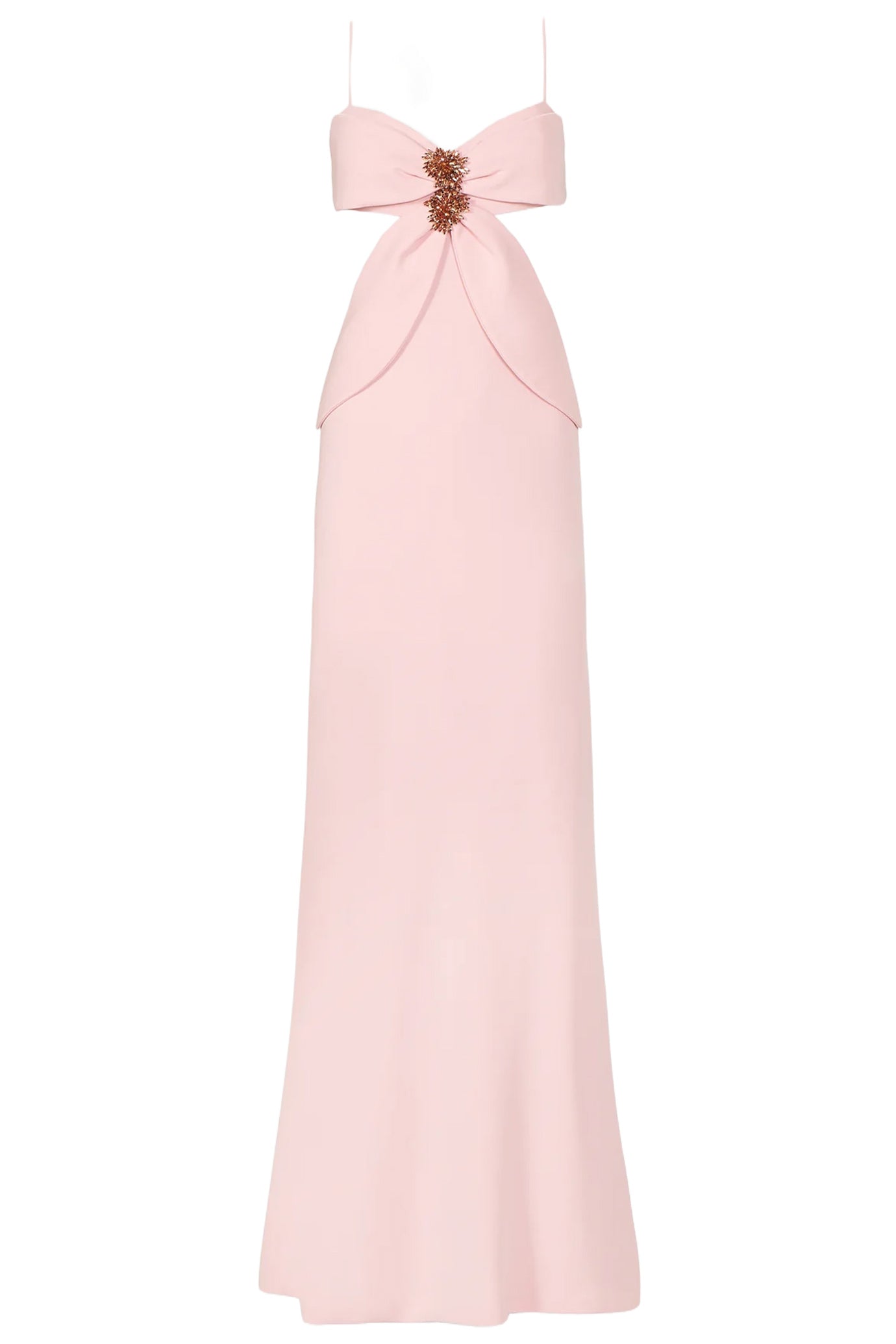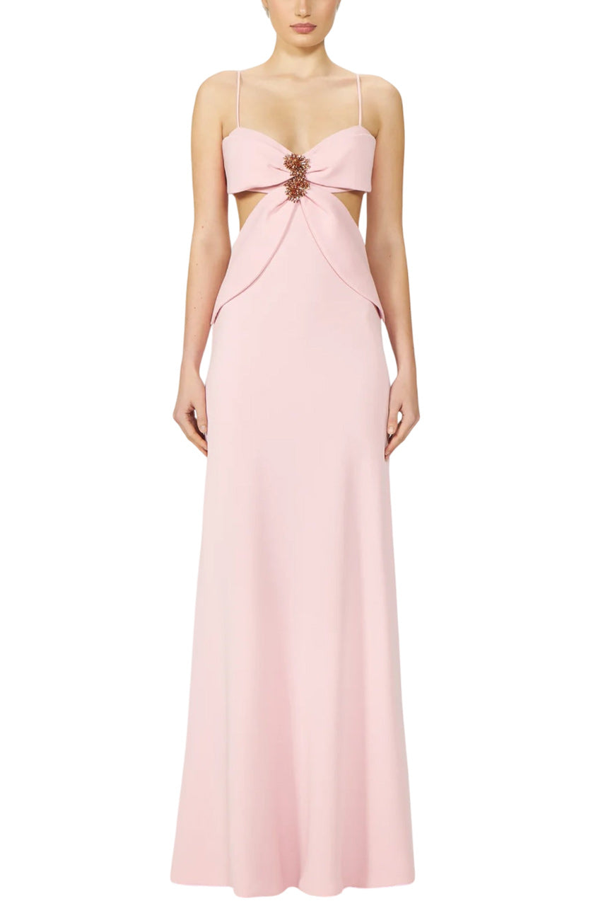 Elevate your formal wardrobe with our Carice Cutout Crepe Gown by Costarellos. The soft pink crepe fabric exudes elegance, while the statement bow and chic cutout add a touch of modern femininity. Adorned with shimmering crystal embellishments, this gown is the perfect combination of luxury and design.