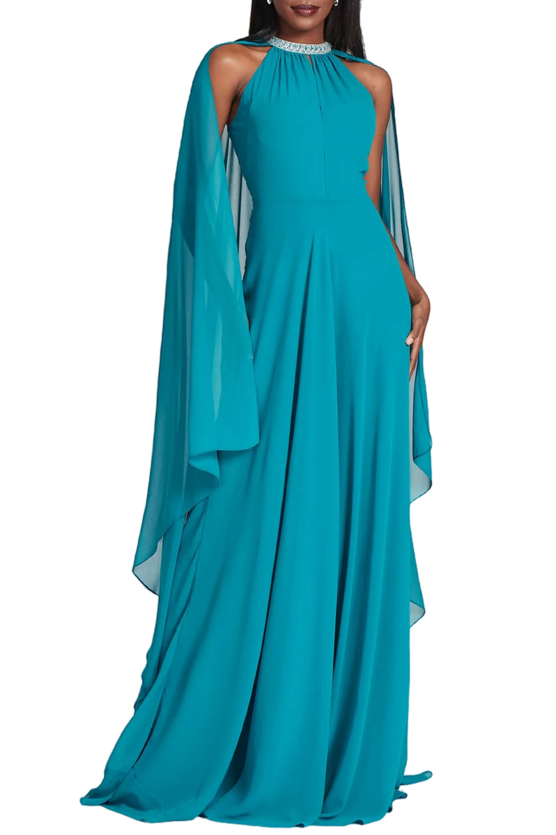 This stunning turquoise chiffon evening gown will impress all at the next big formal event. The elegant look is adorned with a translucent chiffon cape and jeweled neckline. The breathable chiffon material and fuller skirt allow comfortable room for full hips. Perfect for the mother of the bride, mother of the groom, black tie event, or outdoor wedding, this dress can be paired with silver jewelry to compliment the neckline.