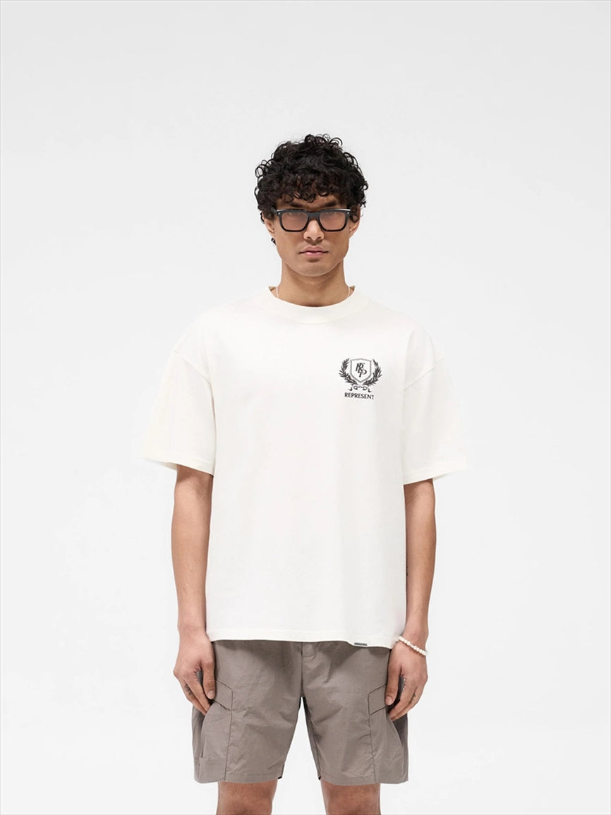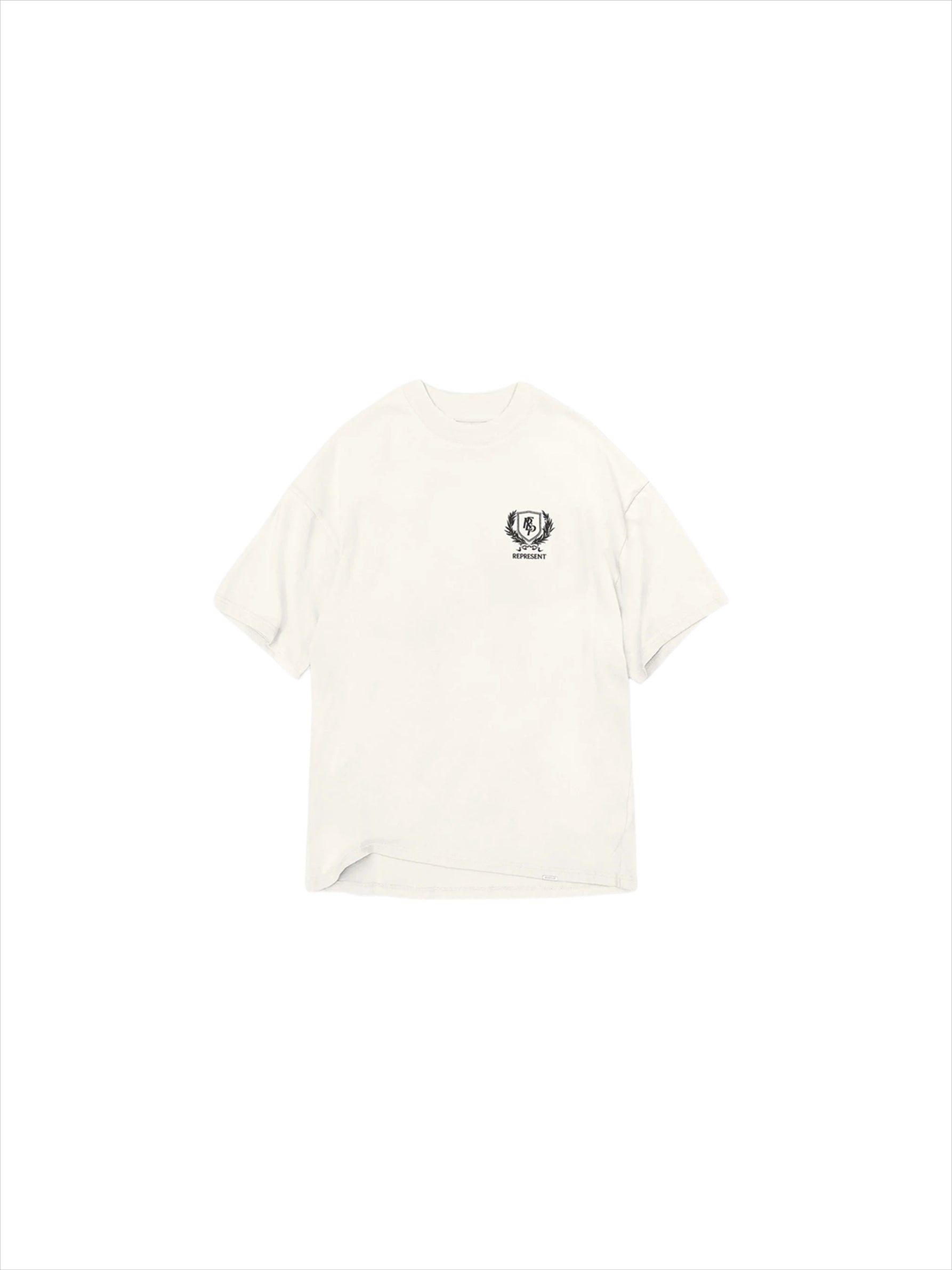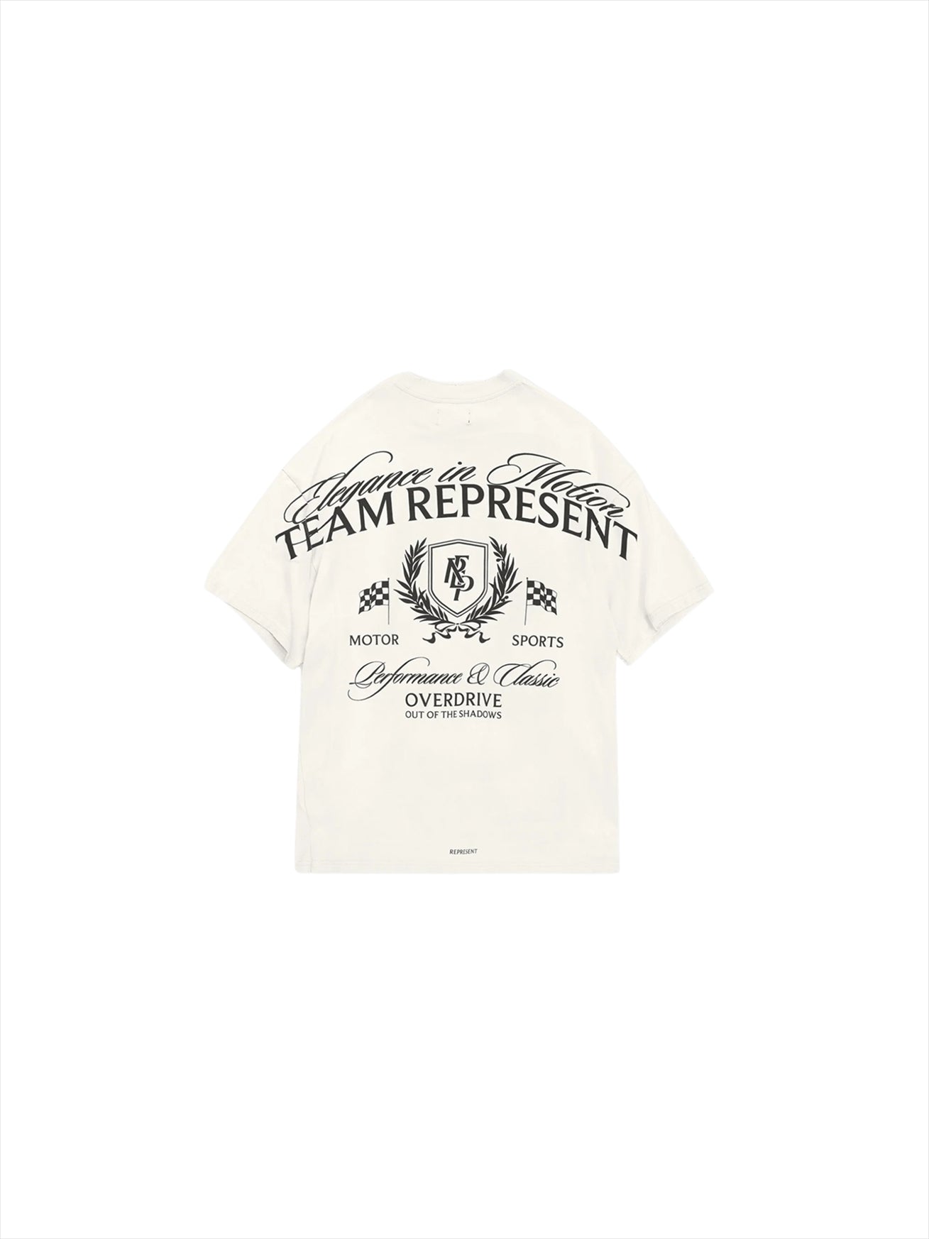 Crest T-Shirt in Flat White: a premium graphic tee with a timeless aesthetic. Crafted for everyday wear, this piece boasts a signature fade-out wash and vintage-inspired look. The puff print and screen print graphics add depth, featuring Overdrive branding on the back and a detailed Crest logo on the chest. Elevating your wardrobe essentials with effortless style.