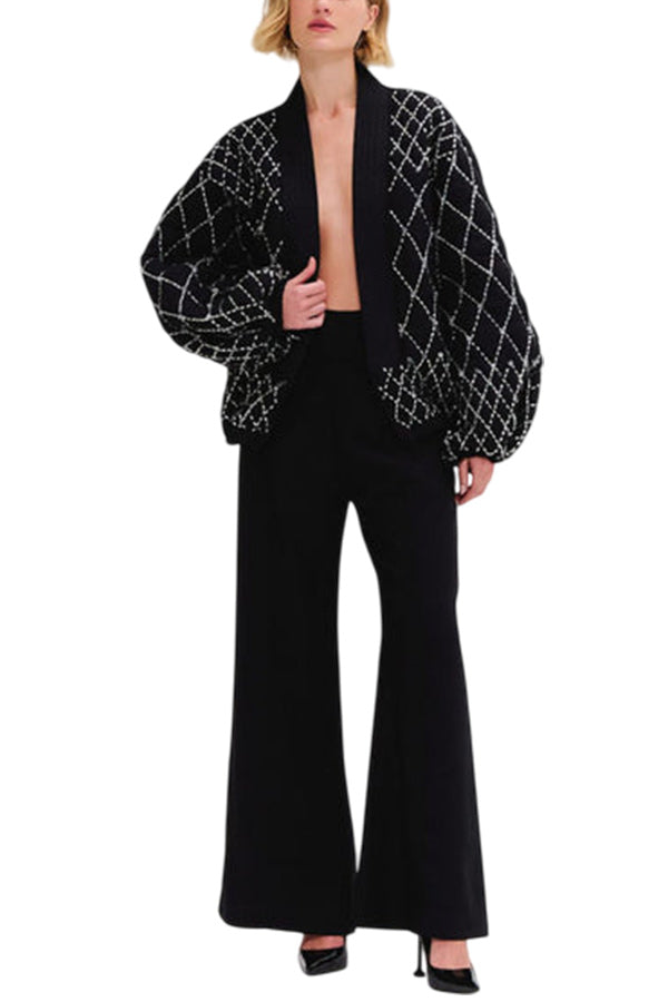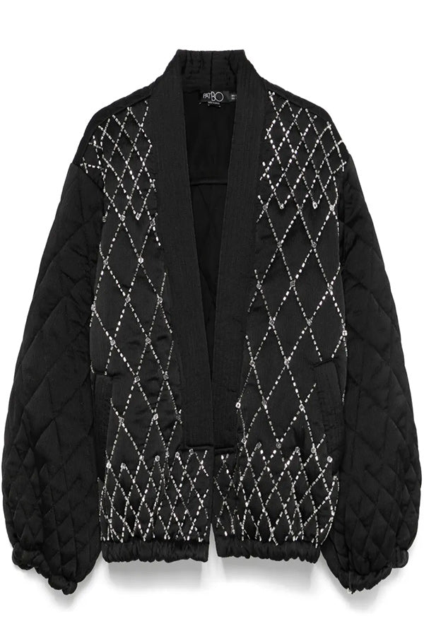This jacket boasts a textured lurex exterior and a striking crystal beading pattern that crosses the front and sleeves. For added practicality, functional side pockets provide secure storage within easy reach.