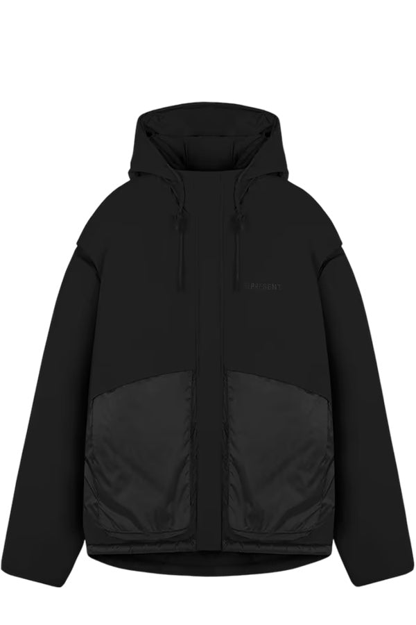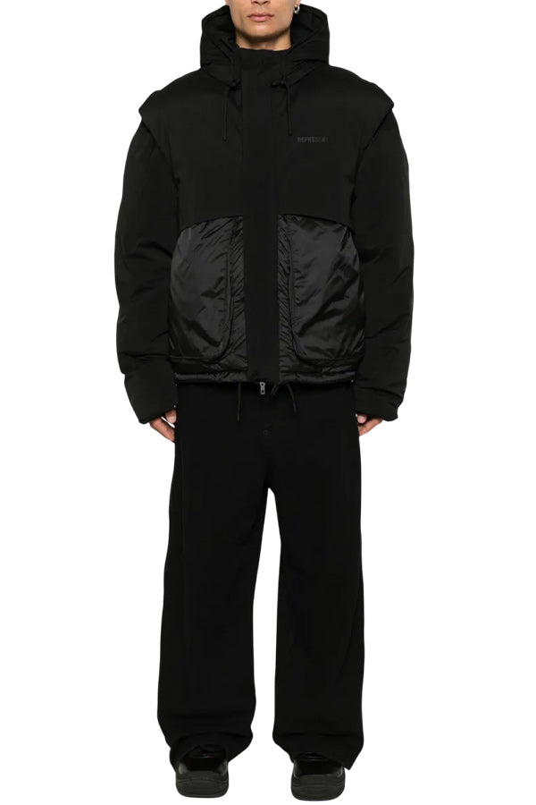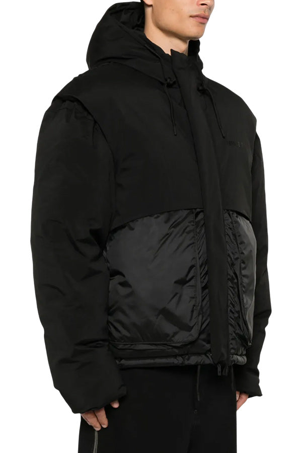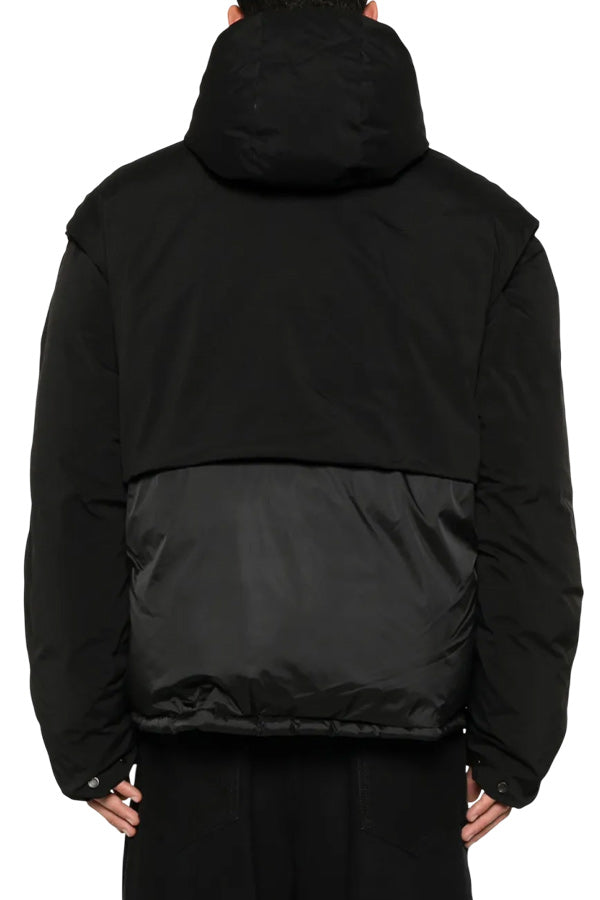 The hooded puffer jacket features a paneled construction with a combination of down and feather fill. A drawstring hood and front zip closure provide adjustable warmth, while a funnel neck and concealed press-stud fastening add protection. Long sleeves have press-stud cuffs and a discreet logo print at the chest. Dual front pockets, side zip pockets, and an internal zip pocket offer practical storage options. A full lining and adjustable hem ensure a comfortable, customized fit.