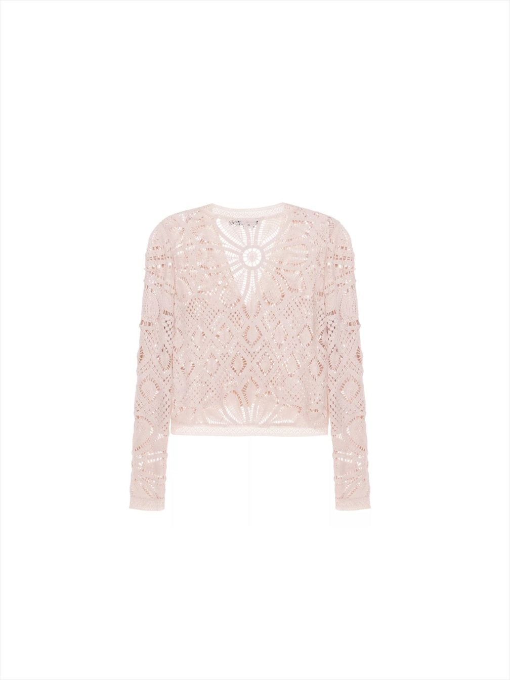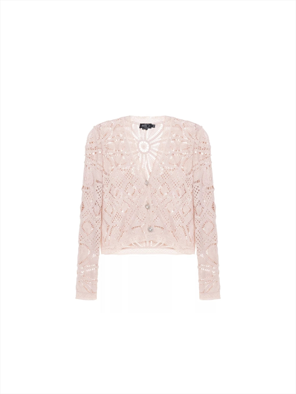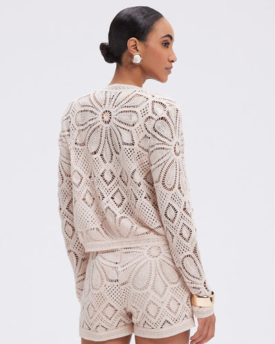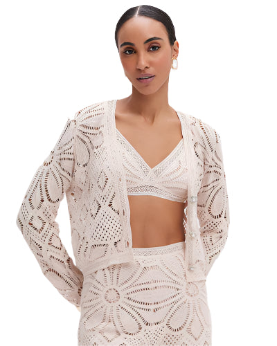 This jacket boasts a V neckline and a fully hand-crocheted fabric with a delicate, sheer design. Long sleeves and an oversized fit create a boxy silhouette. Three functioning pearl buttons adorn the front, secured with a simple yet elegant closure.