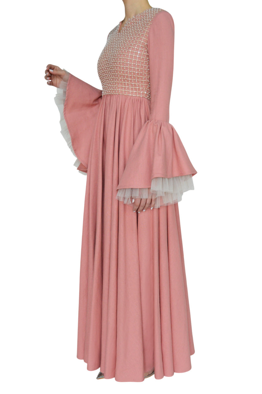 LINEN CAFTAN WITH GRID EMBROIDERY
