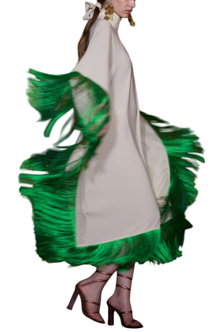 The perfect caftan with a cream and green color combination. The Maya dress has high neckline complemented by flowing green tassels to make a statement.