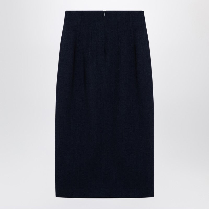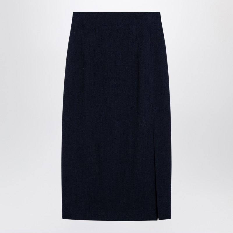 High-waisted navy blue midi skirt crafted from a luxurious virgin wool blend. A side slit adds a touch of modernity, while the back zip fastening provides a sleek finish. Made in France with impeccable attention to detail, this skirt embodies effortless sophistication. Perfect for the modern woman, it's a versatile piece that's both stylish and timeless.