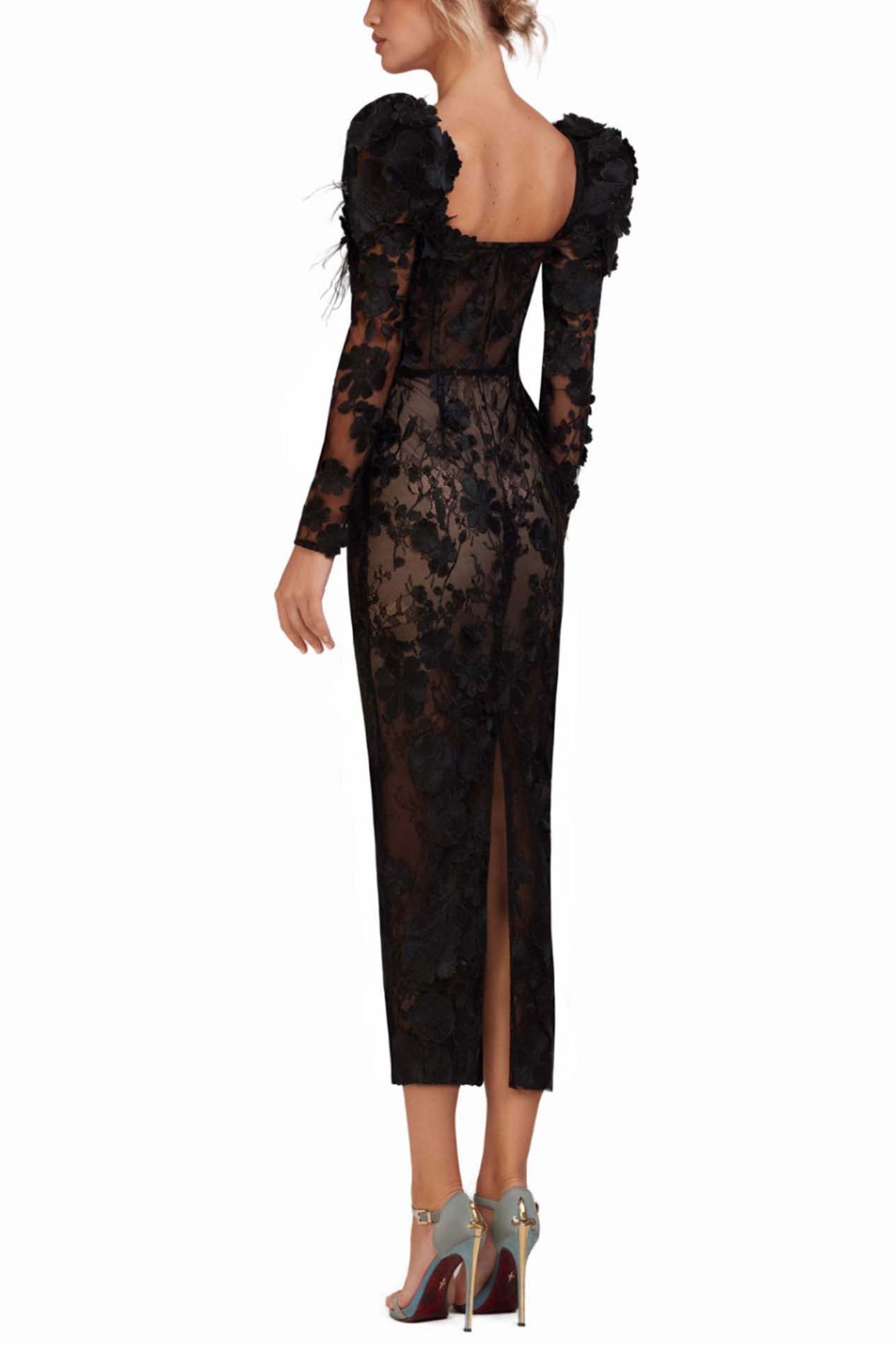 Be the center of attention in the Noir Majesty Midi Dress. This stunning dress combines sophistication and boldness with its form-fitting silhouette and delicate lace overlay adorned with 3D floral appliqués. The structured sweetheart neckline and puffed shoulders add a regal touch, while the sheer detailing creates a refined sensuality. Perfect for cocktail parties and evening affairs, this dress will make a statement with its alluring contrast and intricate detailing.