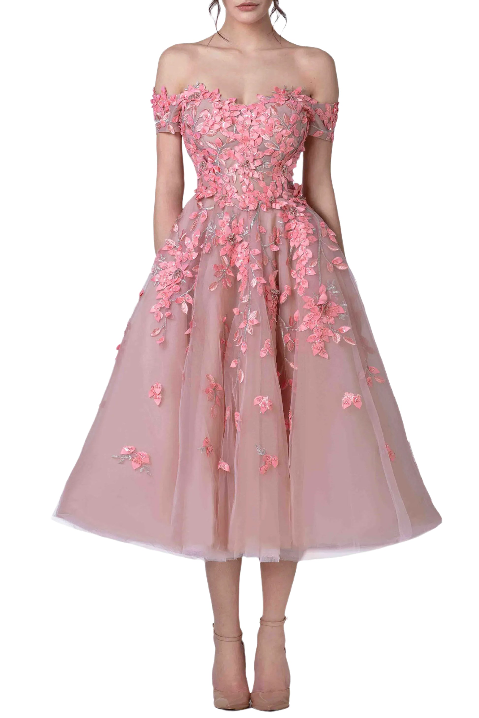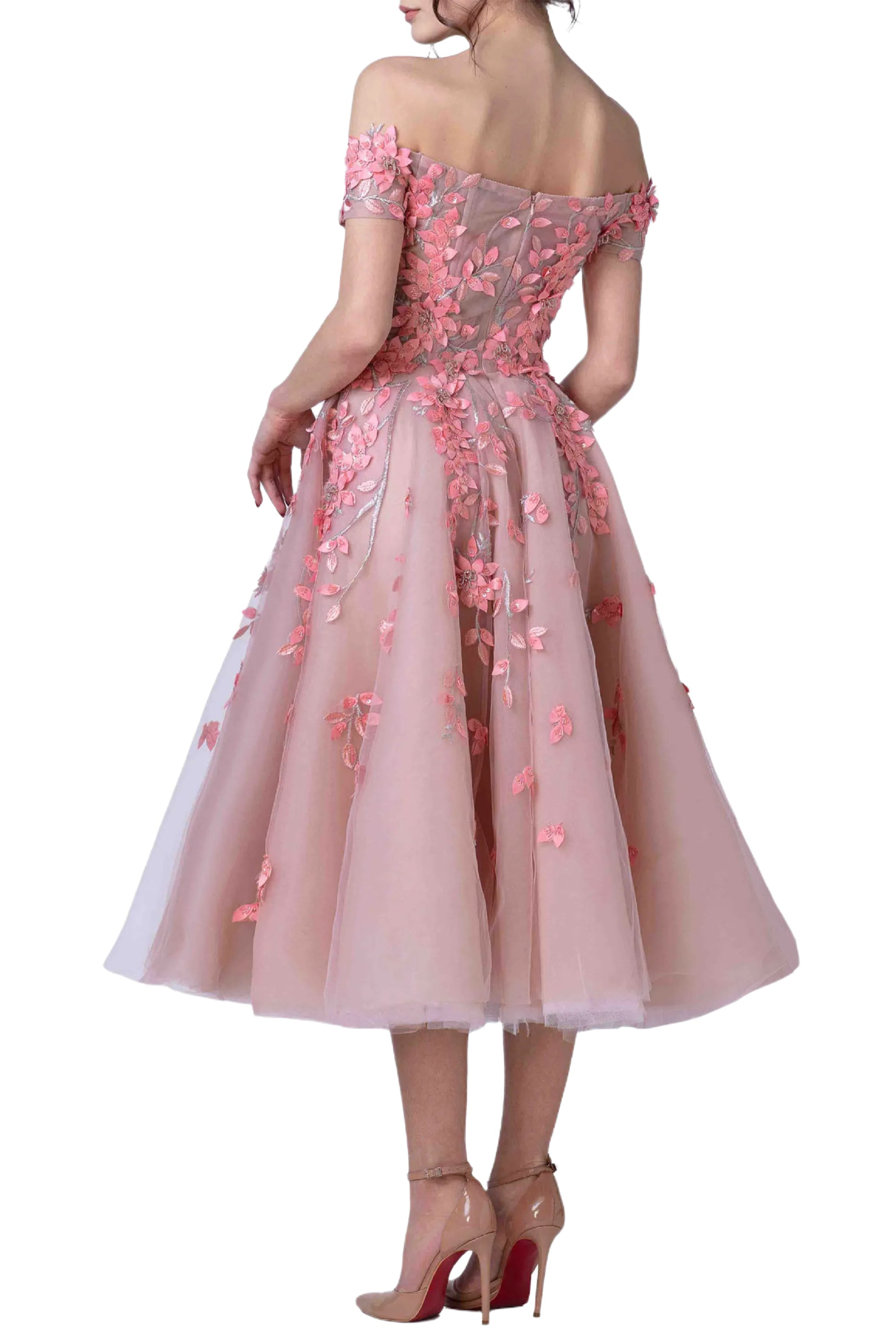 Look stunning in this Off Shoulder Tulle Midi, featuring an off shoulder design, a swing midi skirt, and tulle embroidered floral and leaf motifs. Its unique style and elegant charm will make it the perfect addition to your wardrobe.