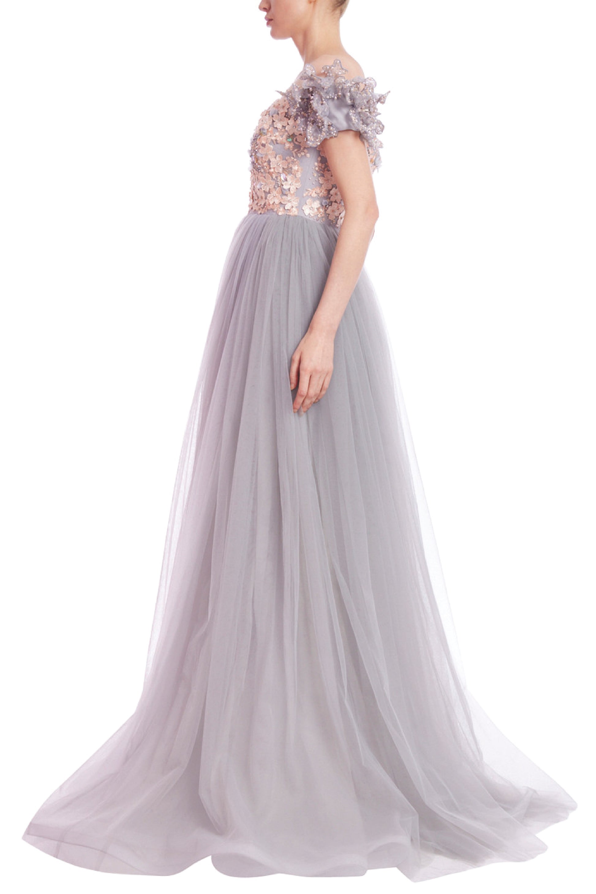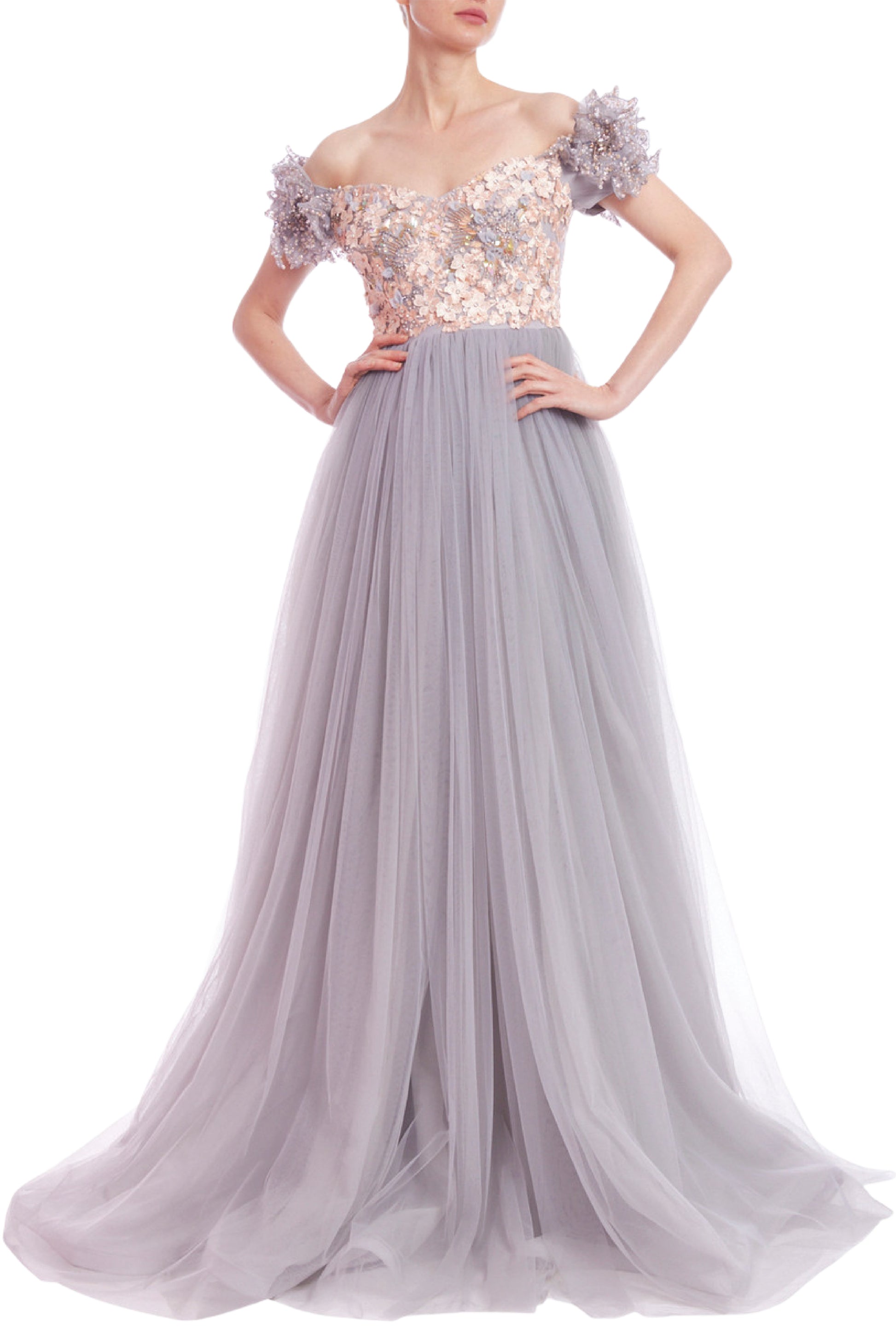 This ethereal Off-the-Shoulder Embellished Bodice Empire Gown is a true masterpiece, fit for a modern-day princess. Hand-sewn floral appliqués adorn the whisper-soft tulle fabric, creating a breathtakingly dreamy look. With its floor-sweeping layers and delicate details, this gown is sure to make you feel like a fairy tale princess on your special day.