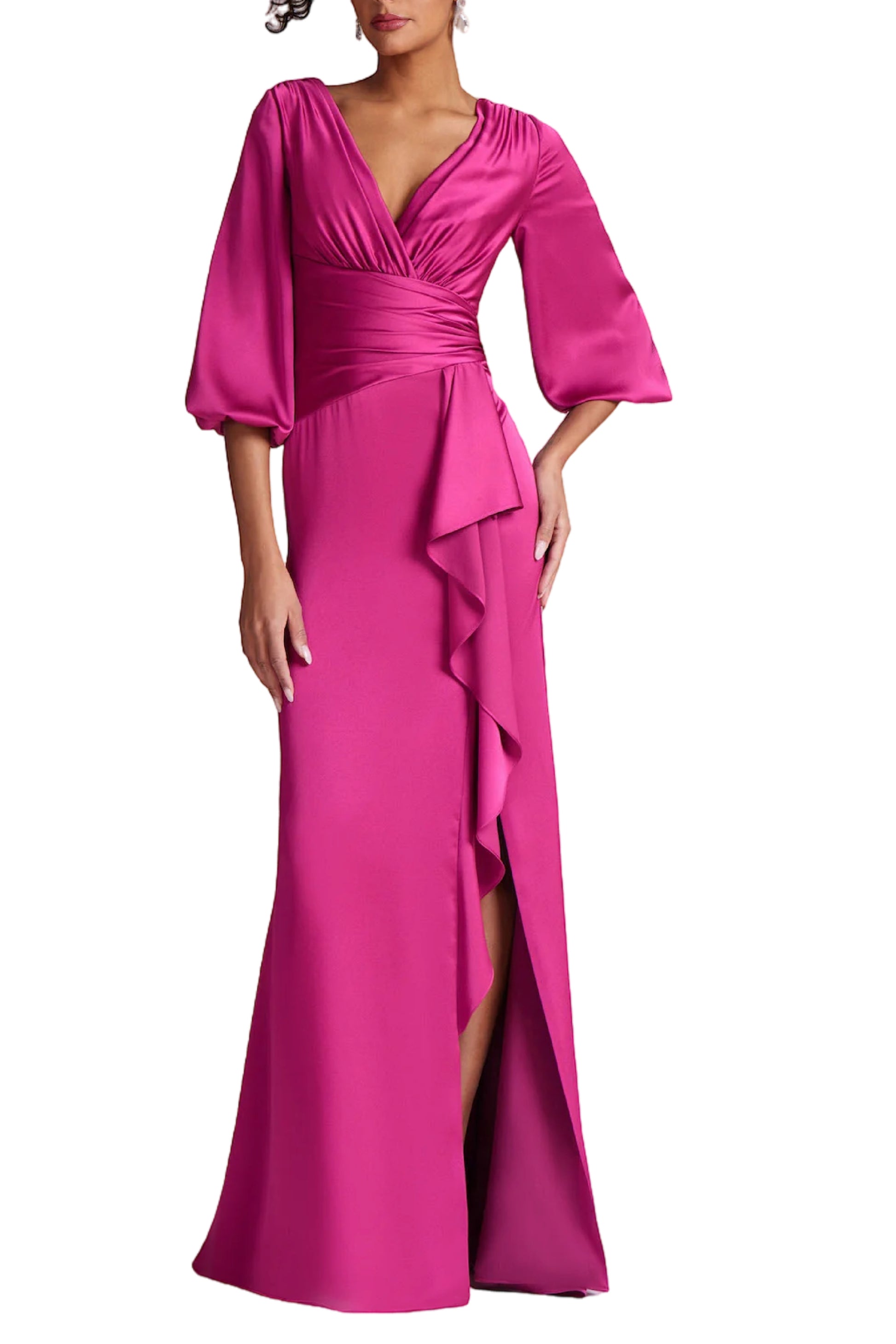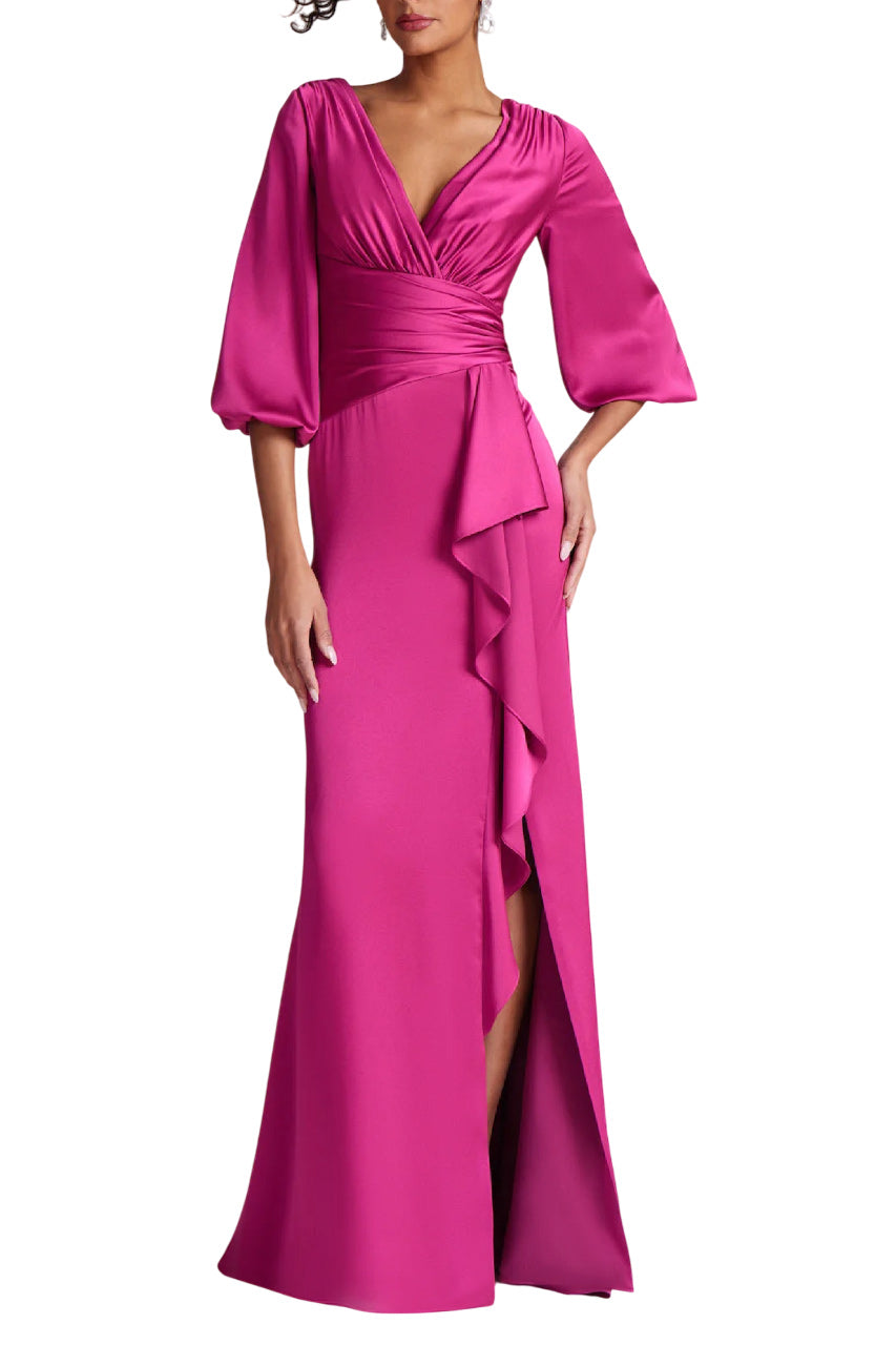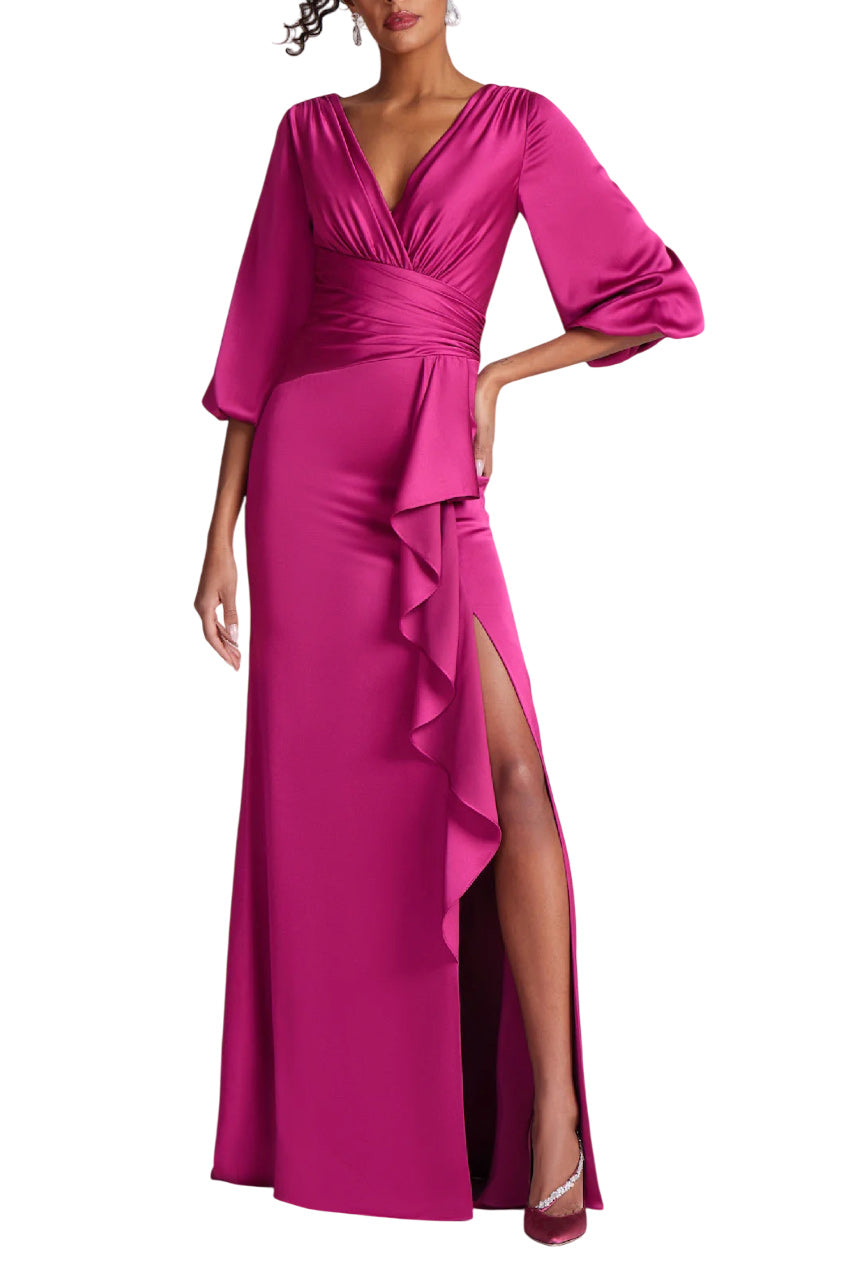 Featuring a v-neckline, flowy sleeves, and side drape alongside the skirt, add elements of flair to the dress. The front slit adds glamor and sophistication to the style.