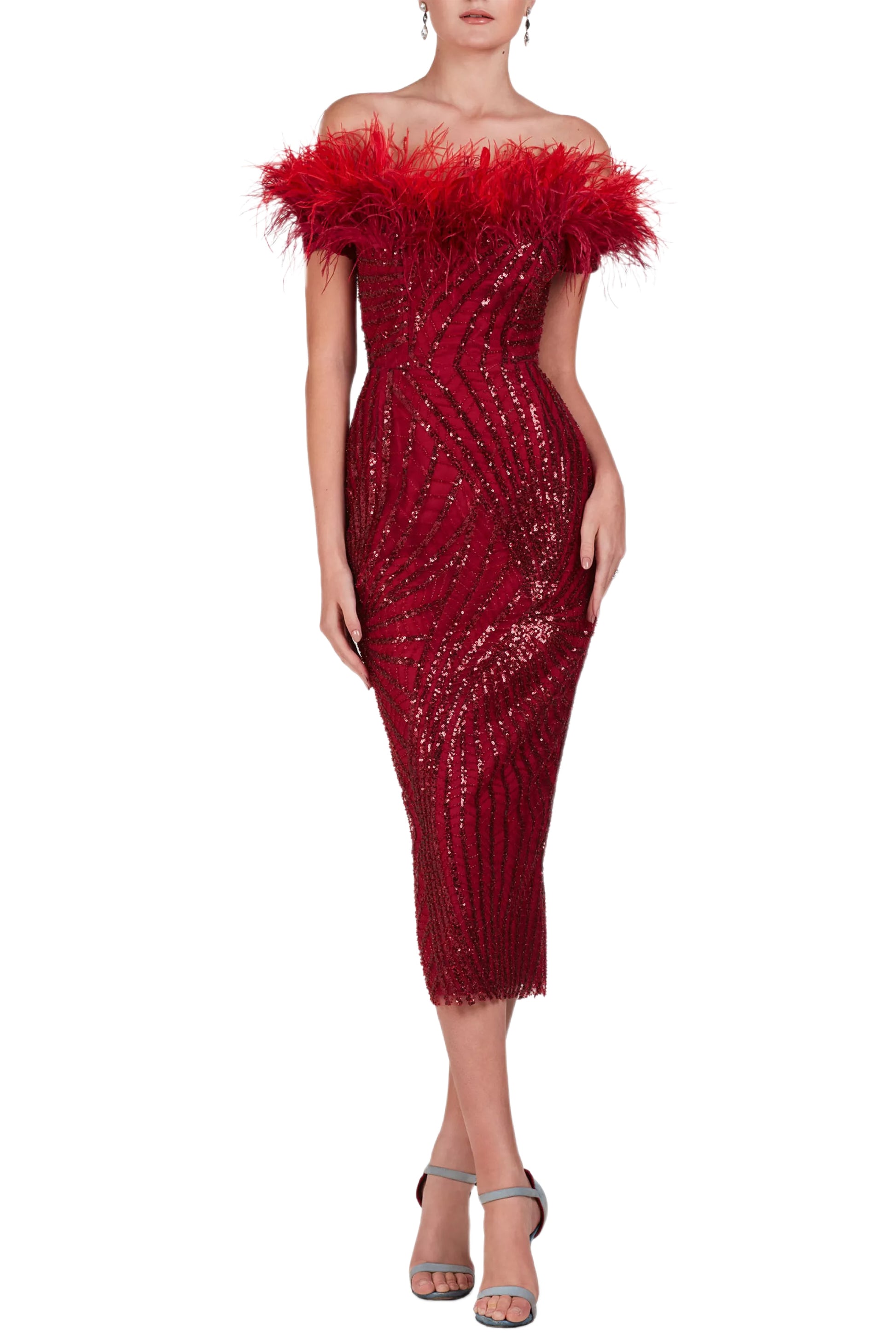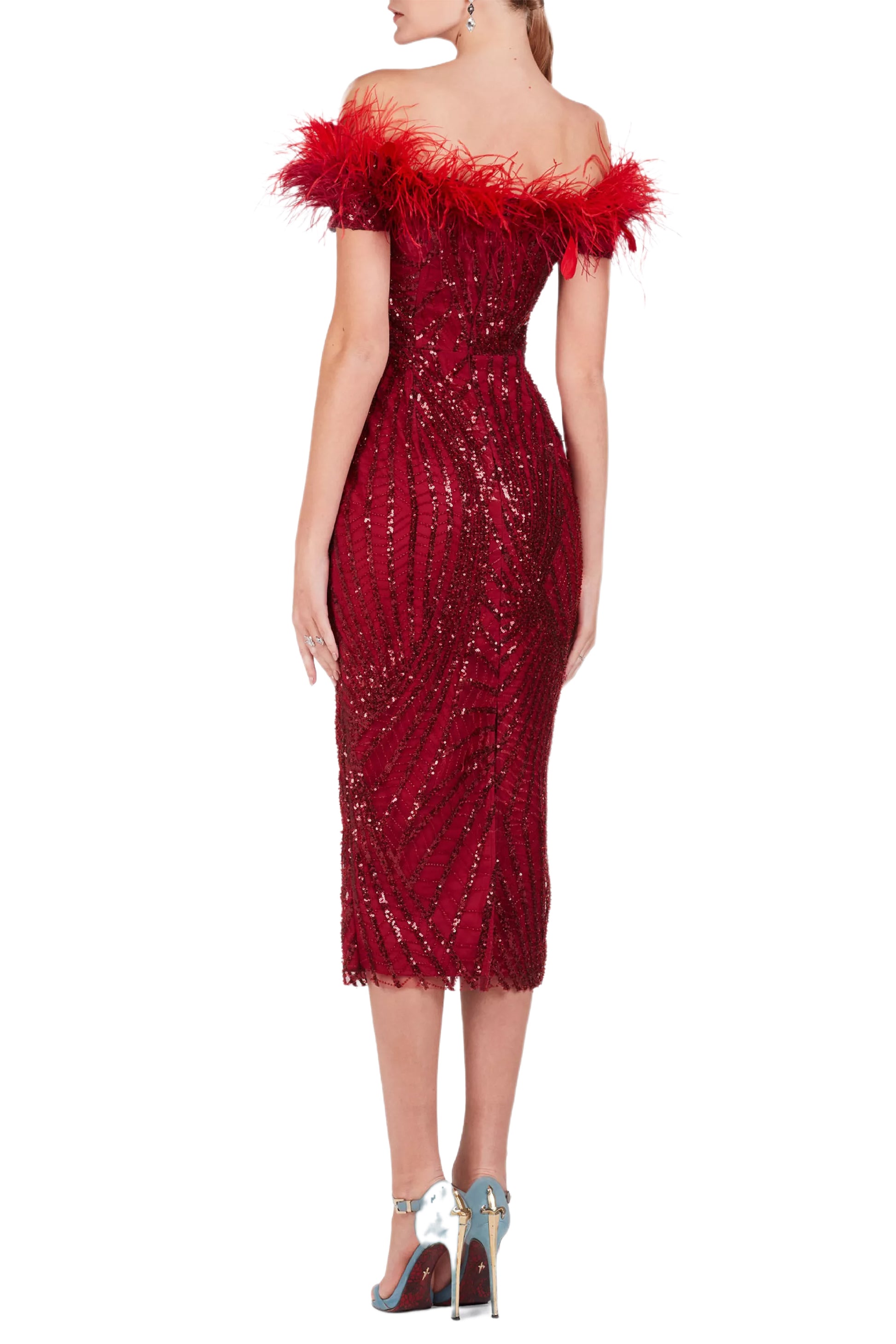 This sequin embellished gown features an off-shoulder neckline adorned with ombré feathered, slim fitting silhouette, and tea-length hemline.