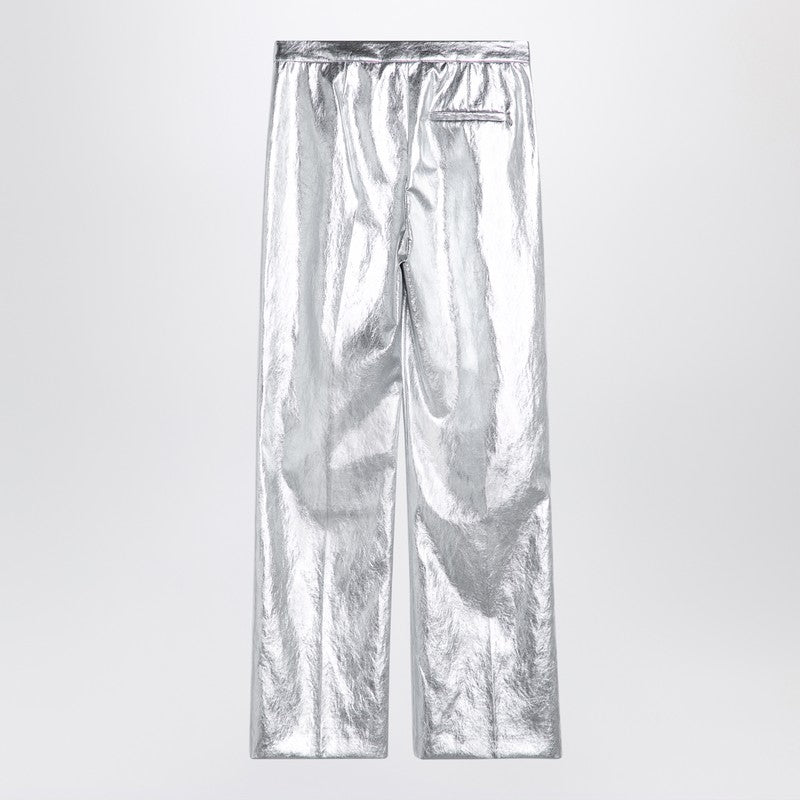 High-waisted, loose-fitting trousers from THE GARMENT, crafted in rich leather. A front zip and hook fastening ensure secure closure, while two side pockets and a back pocket provide practical storage. Front pleats add a touch of elegance, while the relaxed fit creates a comfortable silhouette. Silver hardware complements the metal color, elevating this stylish and versatile piece.