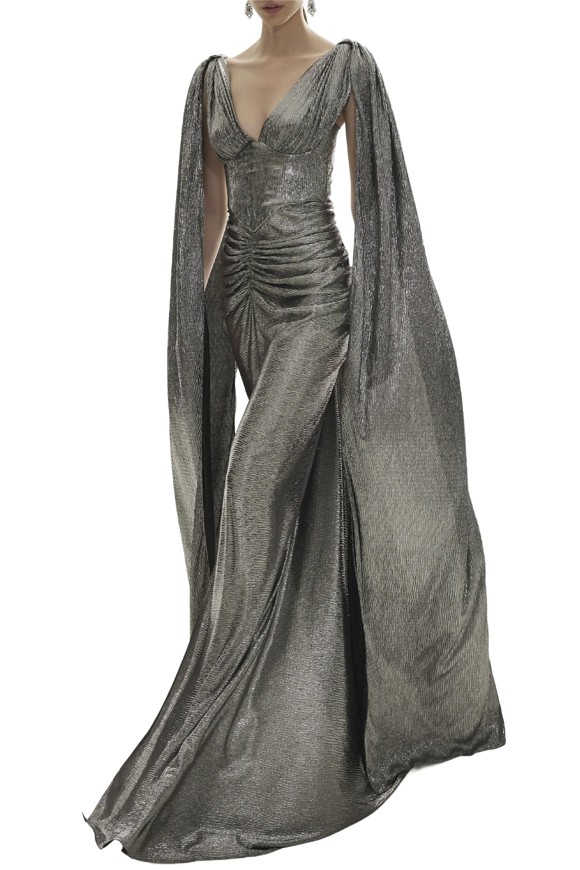 This stunning golden gown features a floor-length design and is accompanied by two elegant long capes, adding a touch of grandeur to any occasion. Perfectly suited for black-tie events, its extra elegance and lavish style will make you the center of attention. Step into the limelight and indulge in the exquisite allure of the Sari dress.