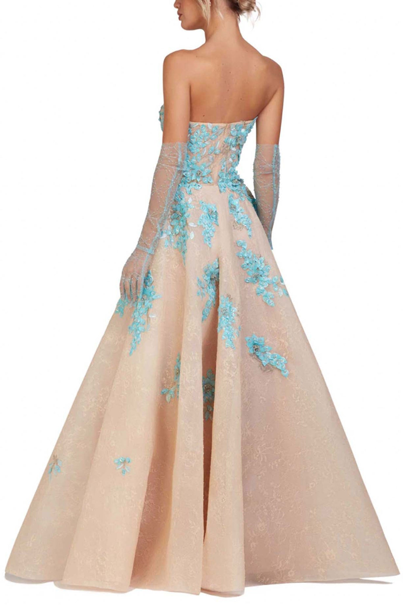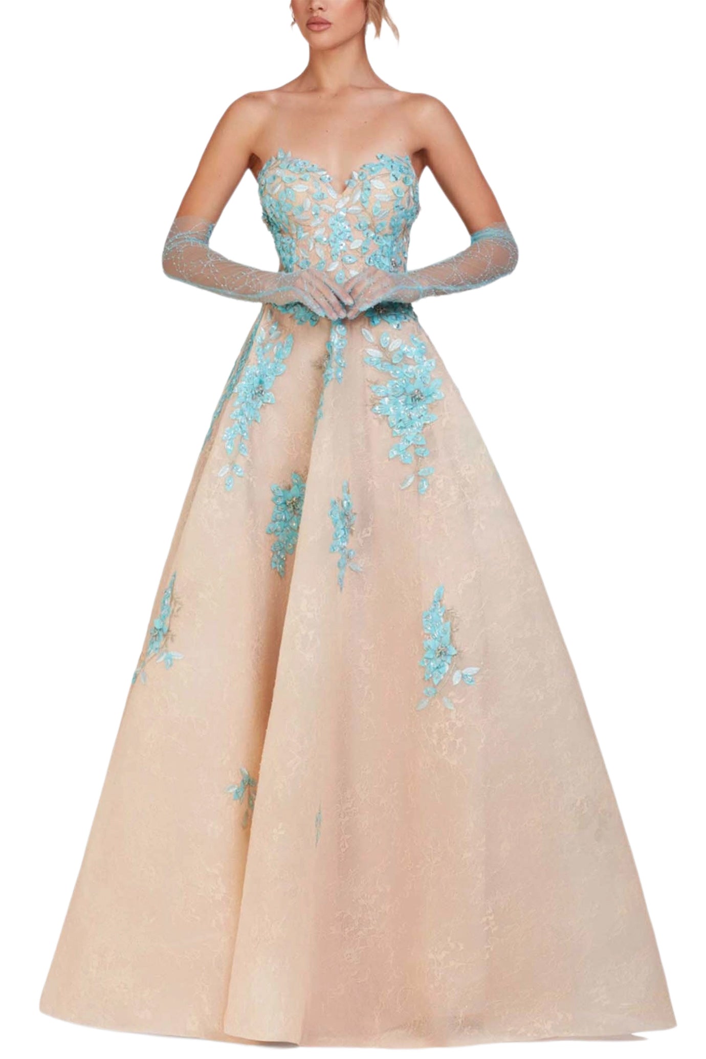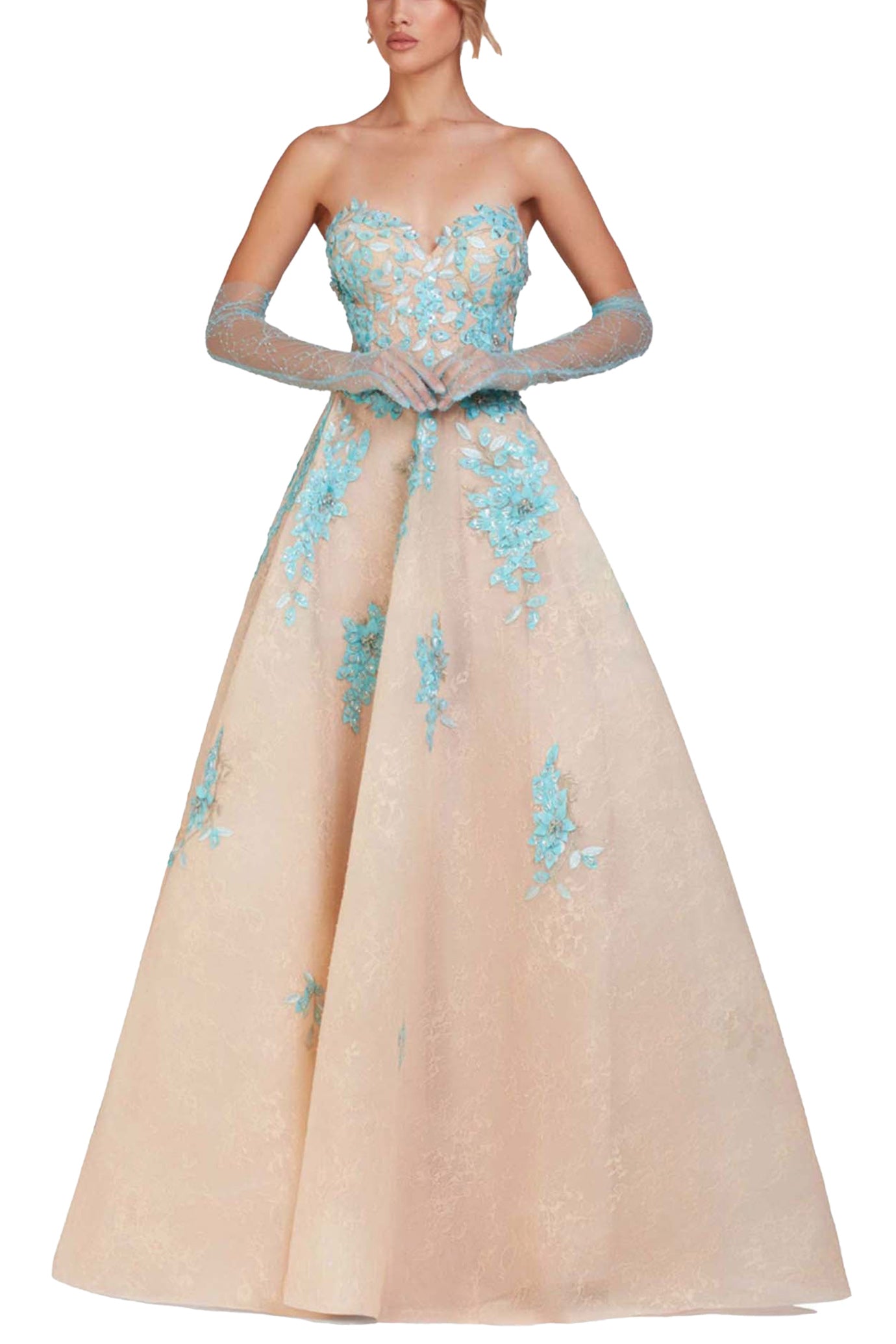 With its romantic sweetheart neckline and ethereal floral appliqués, this gown is a true masterpiece. The vibrant blue accents add a pop of color to the soft blush-nude fabric, Perfect for a bride or fashion-forward individual, this gown is sure to capture attention.
