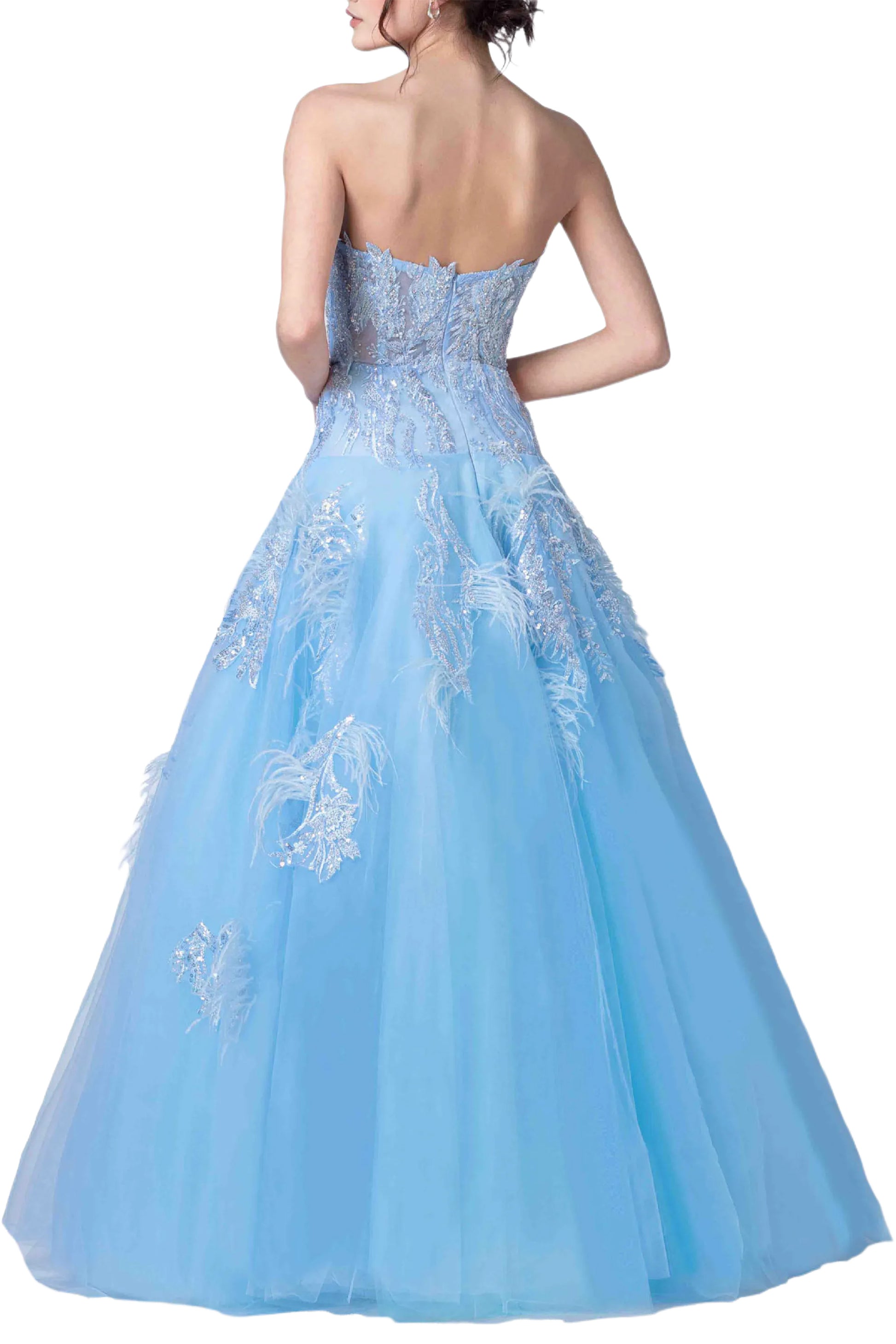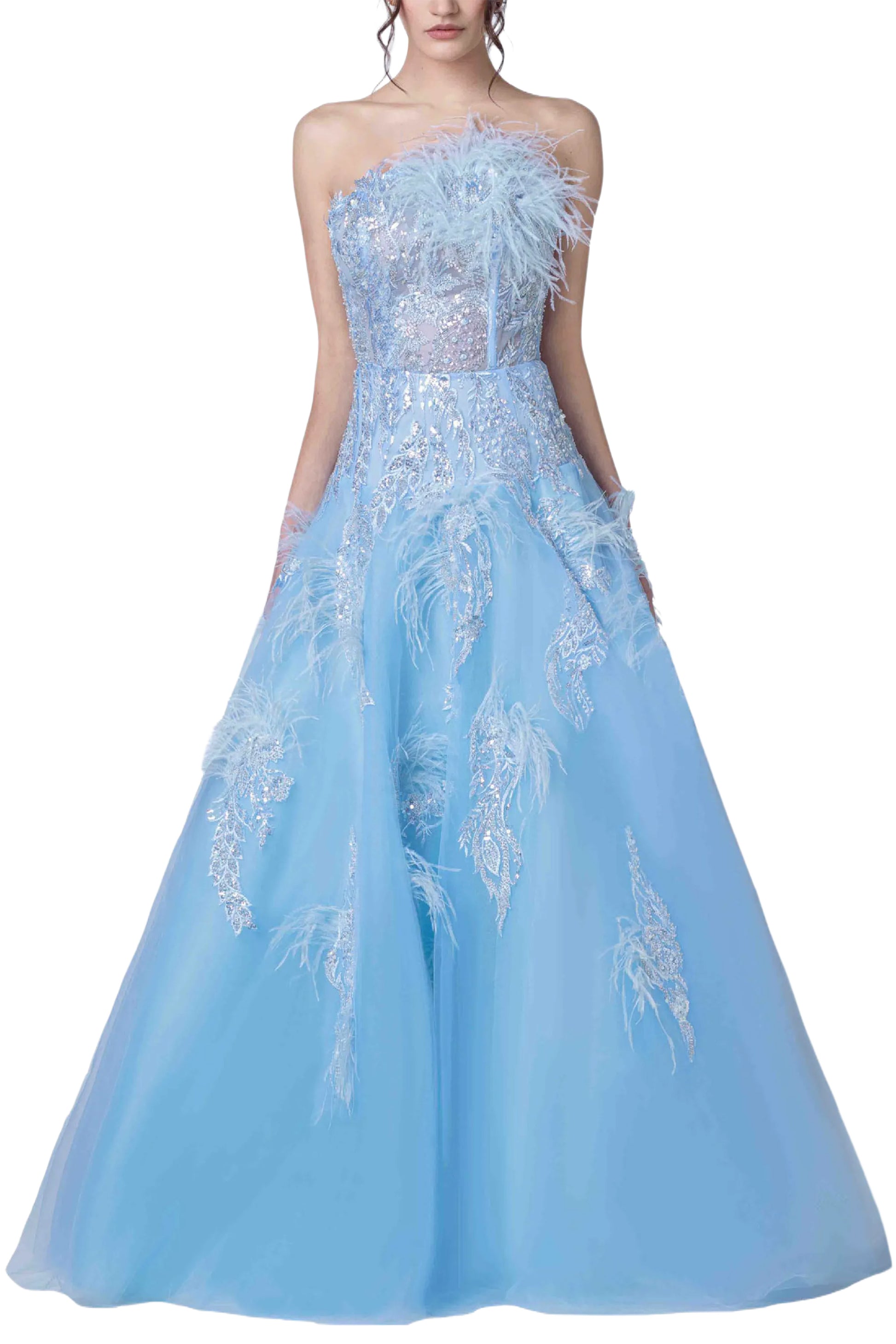 This breathtaking tulle ball gown will make a stunning statement for any special occasion. Crafted with a strapless neckline, beading, embroidery and feathers, this gown is sure to turn heads at your next event.