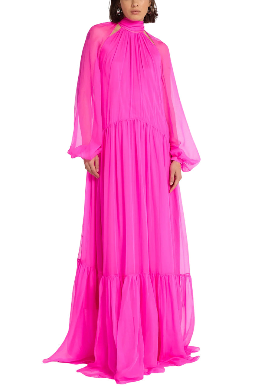 Experience effortless, sophisticated glamour with Safiyaa's Arielle Gown. Crafted from luxurious semi-sheer silk chiffon, it features cutouts and a tie neckline, as well as a pleated tiered skirt. Perfect for any formal event.