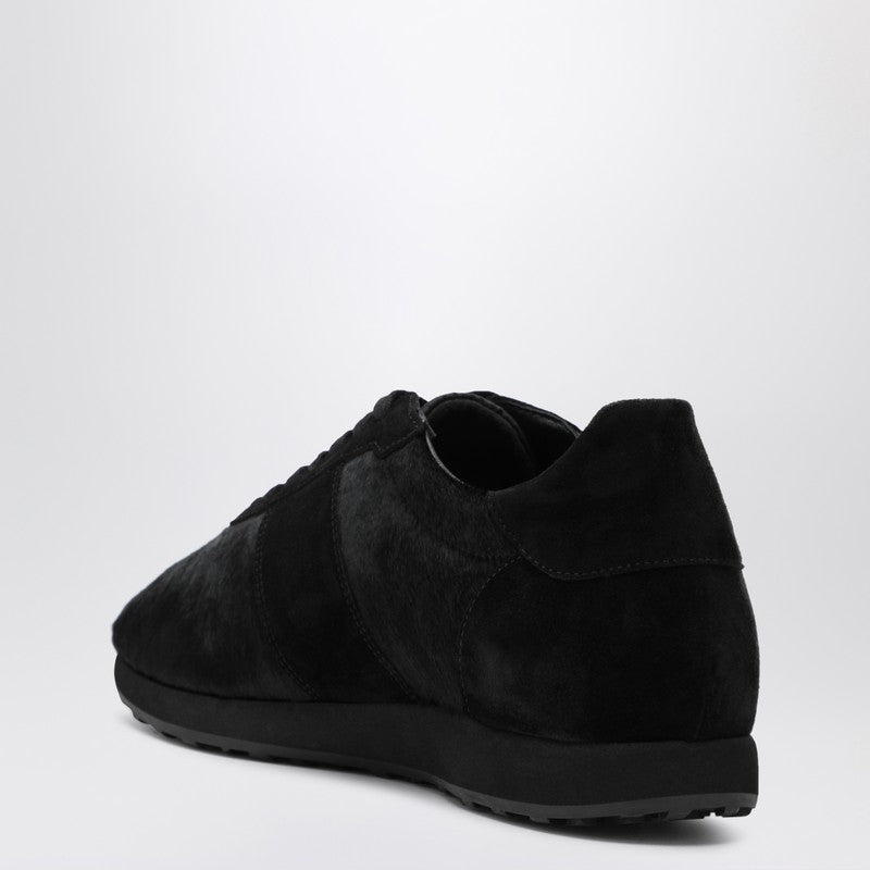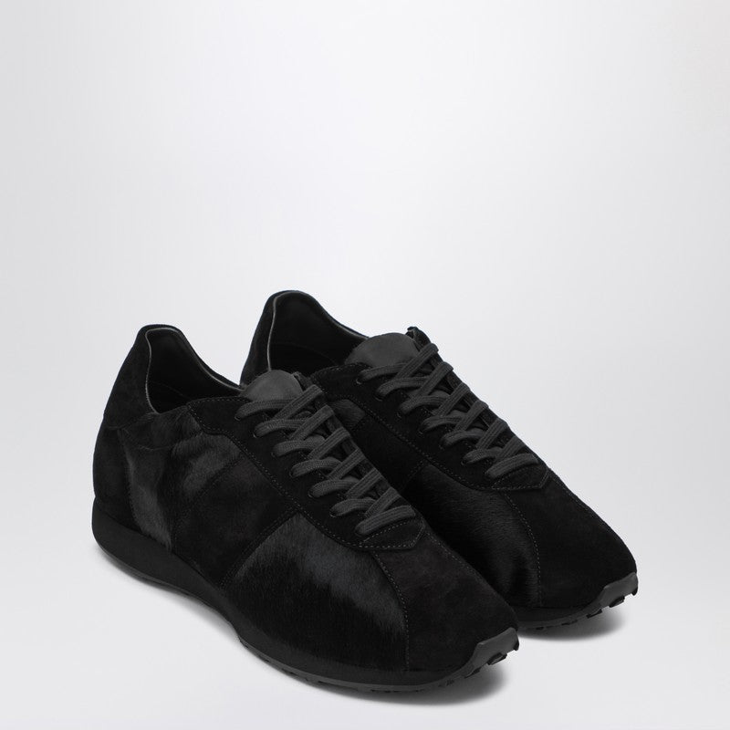The Row sneakers showcase sleek lines in black pony hair, accented with luxurious velvet inserts. A lace-up closure and durable rubber sole provide a comfortable fit. Crafted in Italy, this stylish shoe combines high-quality materials with effortless sophistication.