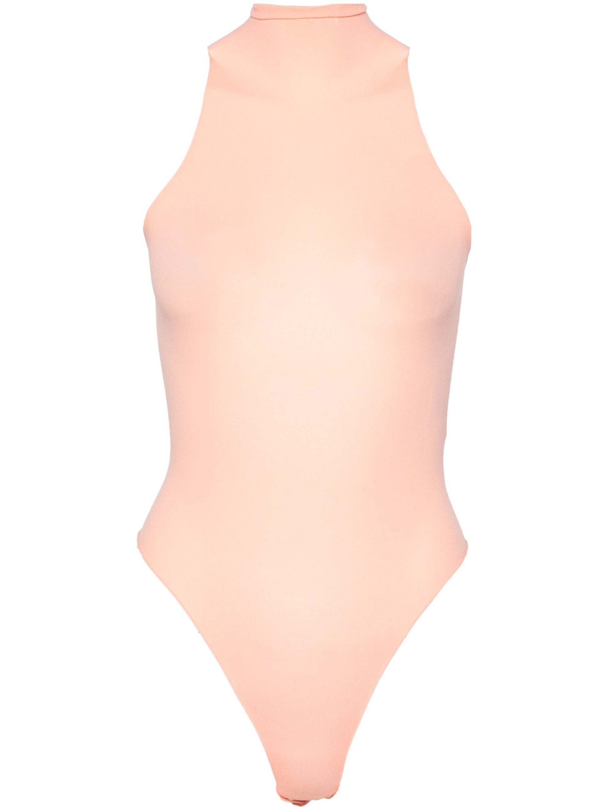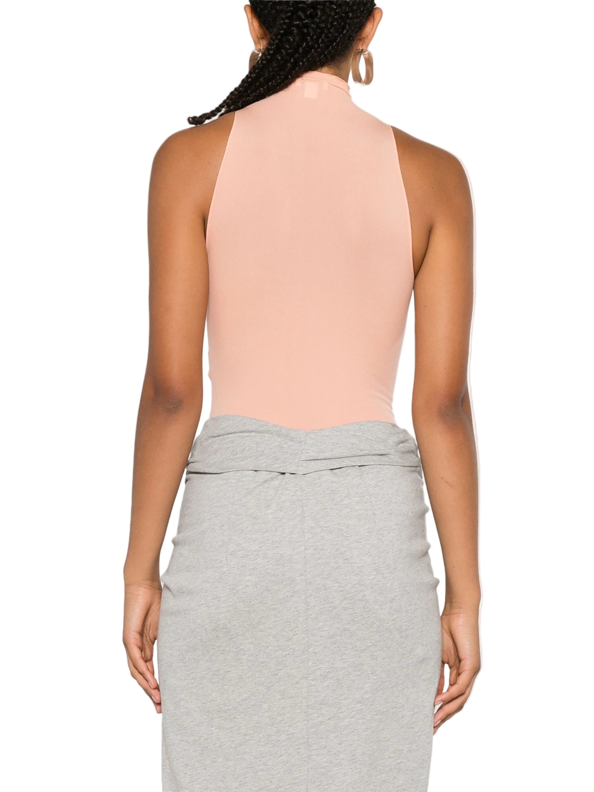 This body features a high neck and sleek racerback design, secured with a snap-fit fastening for effortless wear. The fitted silhouette and sleeveless cut create a modern, athletic aesthetic. Available in a range of sizes, this piece is crafted in Italy for exceptional quality and style.