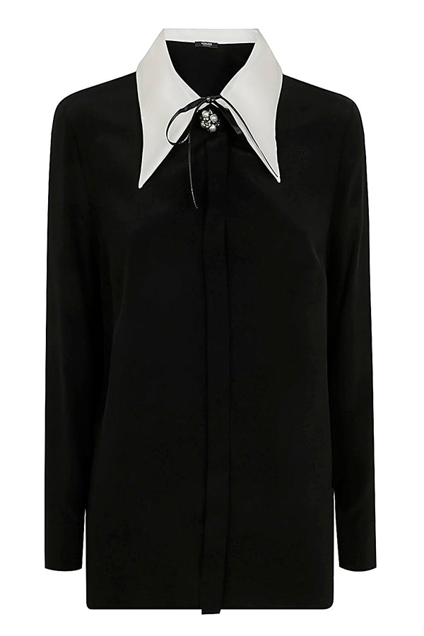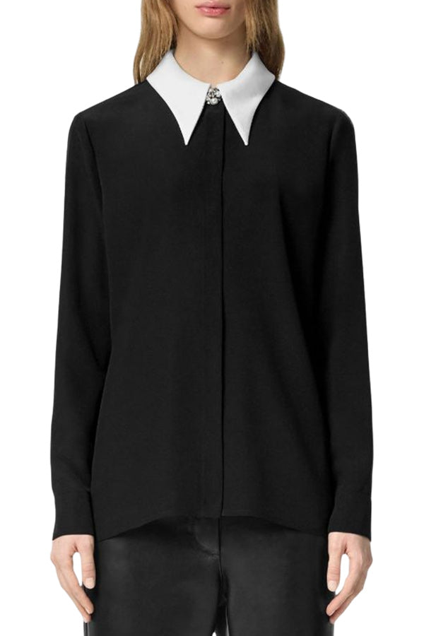 Expertly crafted from premium silk, this refined shirt features long sleeves and a contrasting collar. Hidden buttons on the front closure add a touch of understated elegance.