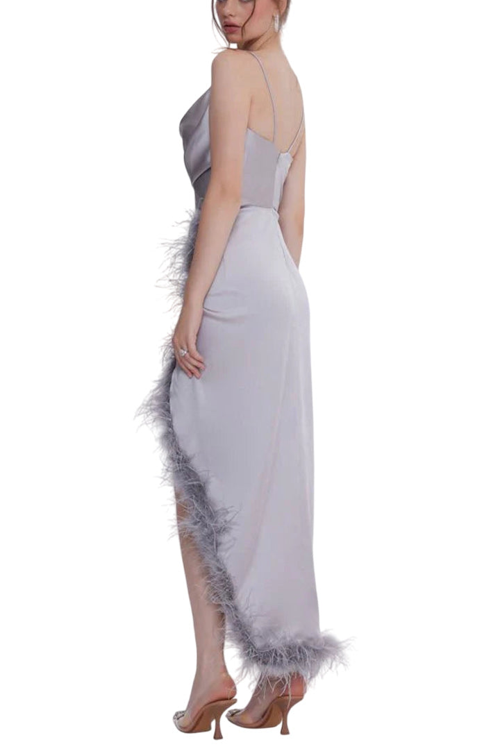 This dress features spaghetti straps, a draped bodice, and a wrap-style skirt embellished with feathers.