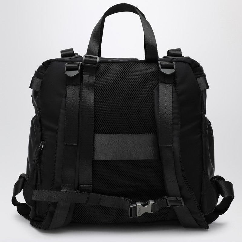 Waterproof backpack made from black recycled nylon. Horizontal design with a zip closure and main compartment for organized storage. Additional features include a front zipped pocket and two side pockets with drawstrings, a padded inner pocket, and a security pocket on the back. Adjustable and padded shoulder straps ensure comfortable wear. Contrast lining adds a touch of style. Made in Italy.