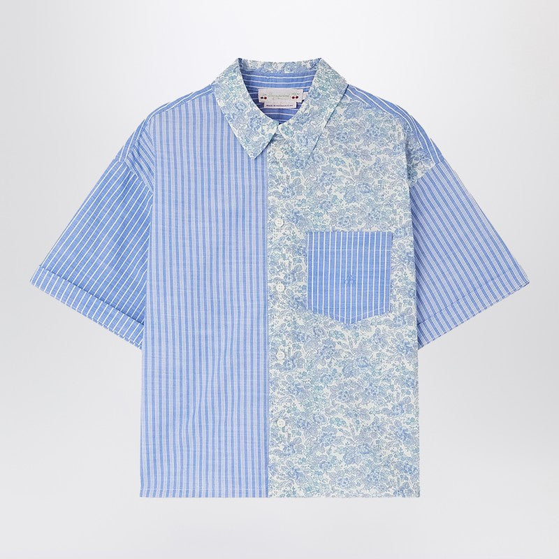Light blue Bonpoint shirt crafted from soft cotton. Features front buttoning, a unique patchwork design, short sleeves with button cuffs, and a chest pocket adorned with embroidered logo.