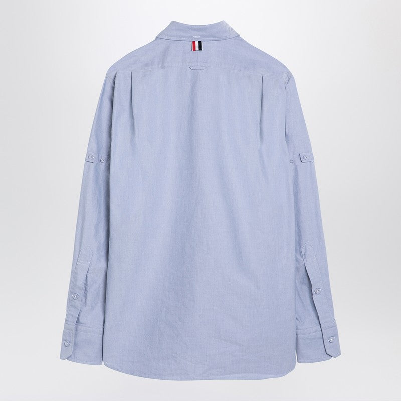 Blue cotton shirt from Thom Browne, characterised by a button-down collar, long sleeves with button accents, a chest pocket and a front button placket. The design features a subtle tricolour detail on the back and a curved hem. Crafted from high-quality cotton, this shirt makes a sophisticated addition to any wardrobe. Available in a range of sizes, perfect for dressing up or down.