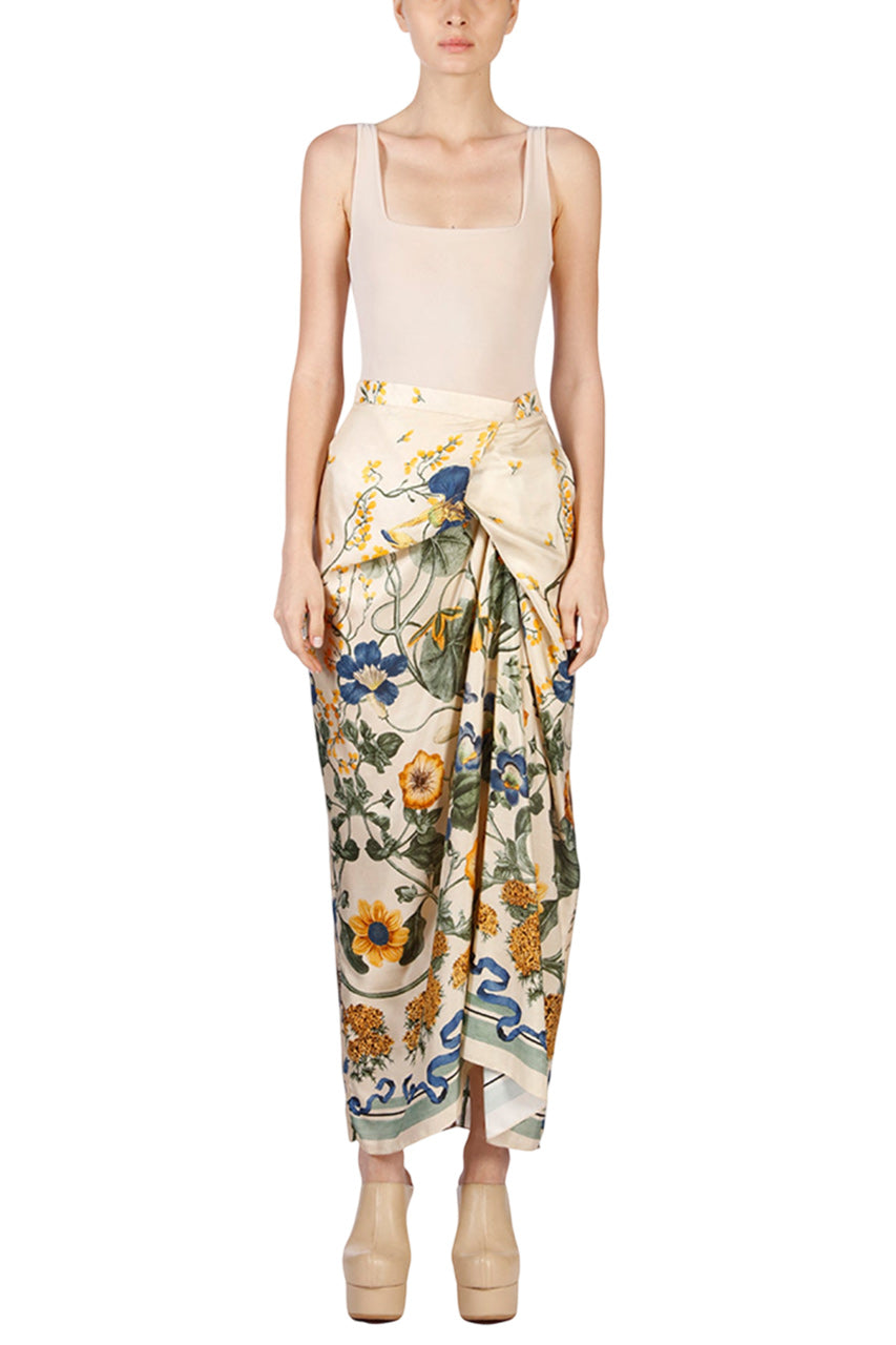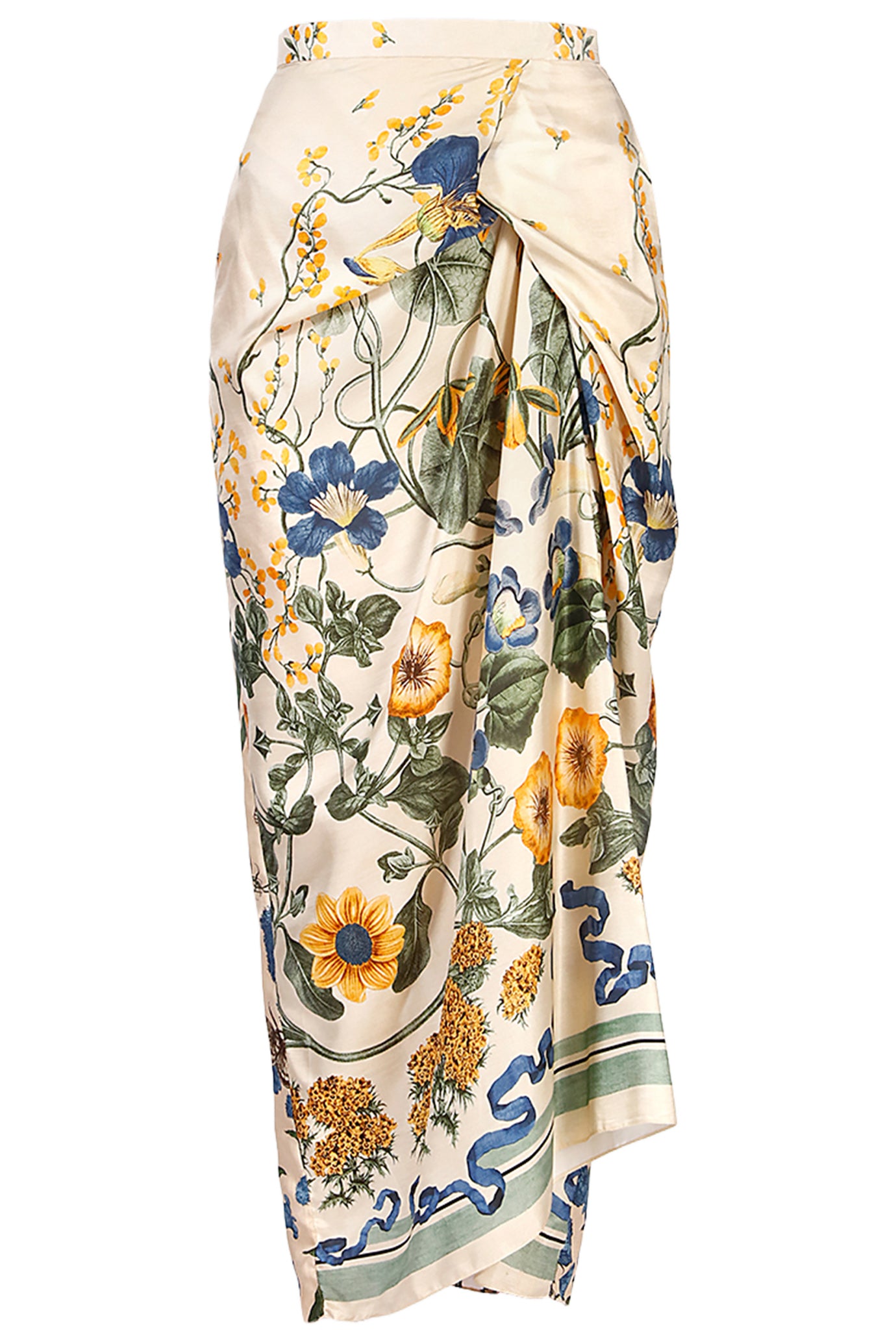 The Morninga Wrap Skrit by Biyan boasts a luxurious silk fabric and an elegant printed design. Expertly crafted, this skirt exudes sophistication and effortless style. Perfect for any occasion, elevate your wardrobe with this must-have piece.