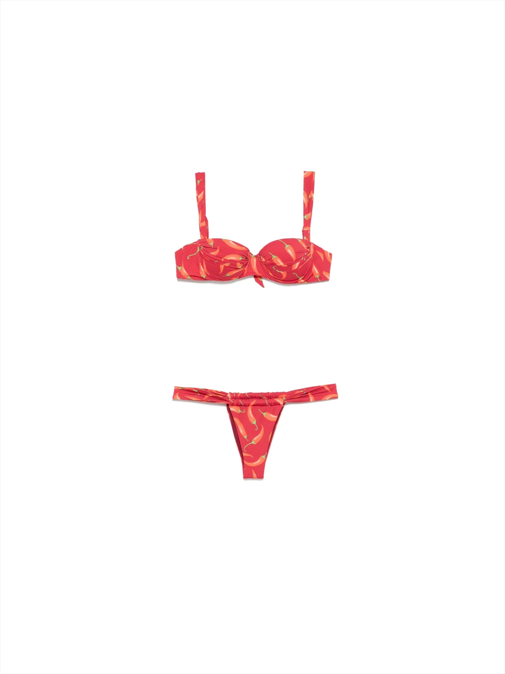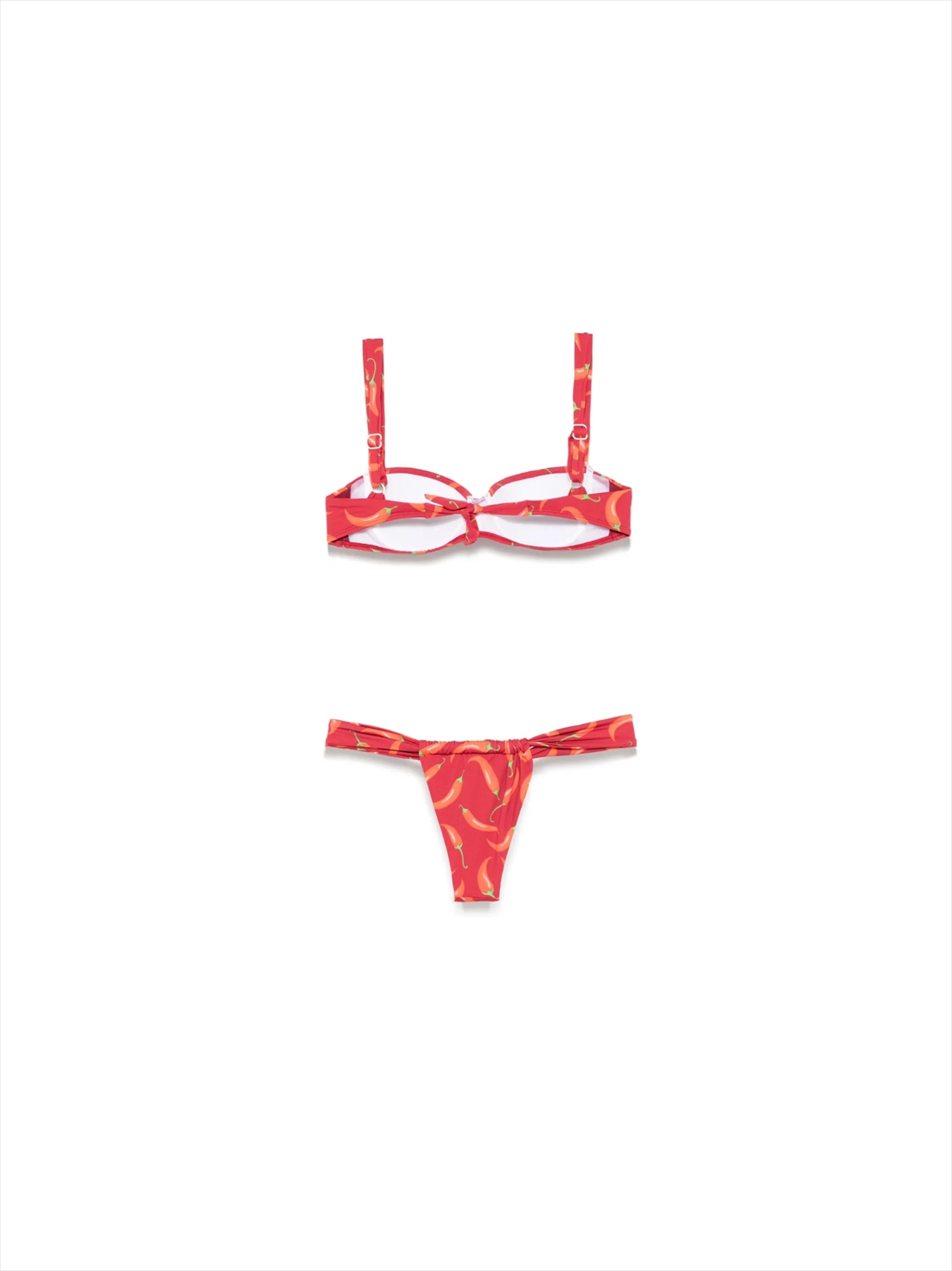 Leslie Amon Paloma bikini set in bold red chilly print. This vibrant ensemble features a striking combination of color and pattern. The bikini top and bottom are crafted with precision to provide a secure, flattering fit.