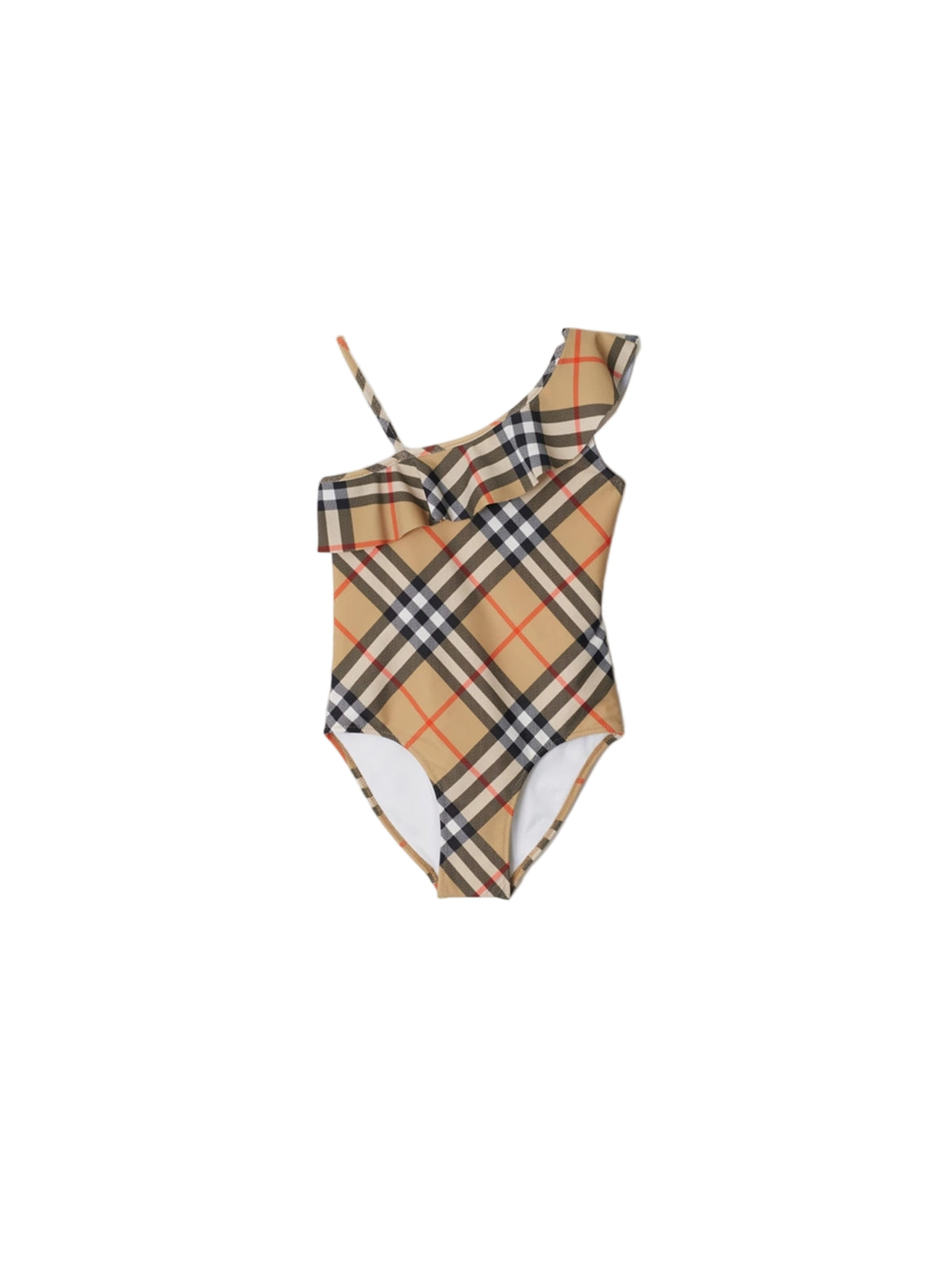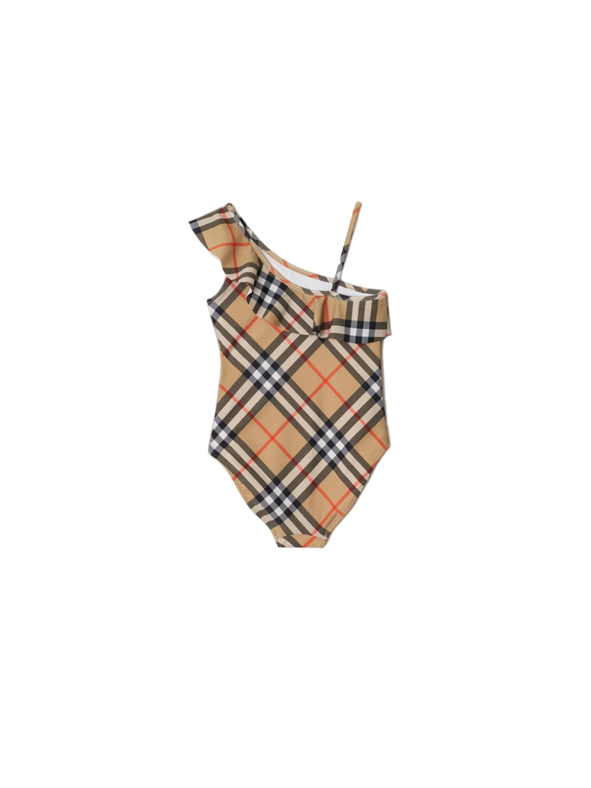 This Burberry Check-printed swimsuit showcases the iconic design in a modern, asymmetric silhouette. Crafted from stretchy nylon for a comfortable fit, it features a delicate ruffled neckline and a timeless twist on the classic Burberry look. Part of the Burberry Classics collection, this wardrobe staple offers a fresh take on a fashion favourite.