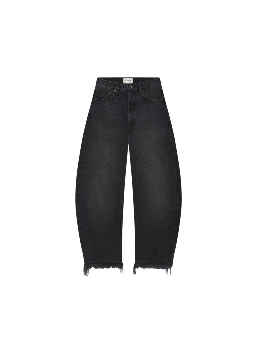 Introducing the reimagined Bubble jeans, now with a streamlined 27-inch inseam. This modern take on the barrel silhouette features a high-rise fit and curved outseam, creating a playful, exaggerated effect. Dark wash and a raw, fringed hem add a touch of effortless cool, giving these jeans a pre-loved look that's uniquely yours. A wardrobe staple redefined.