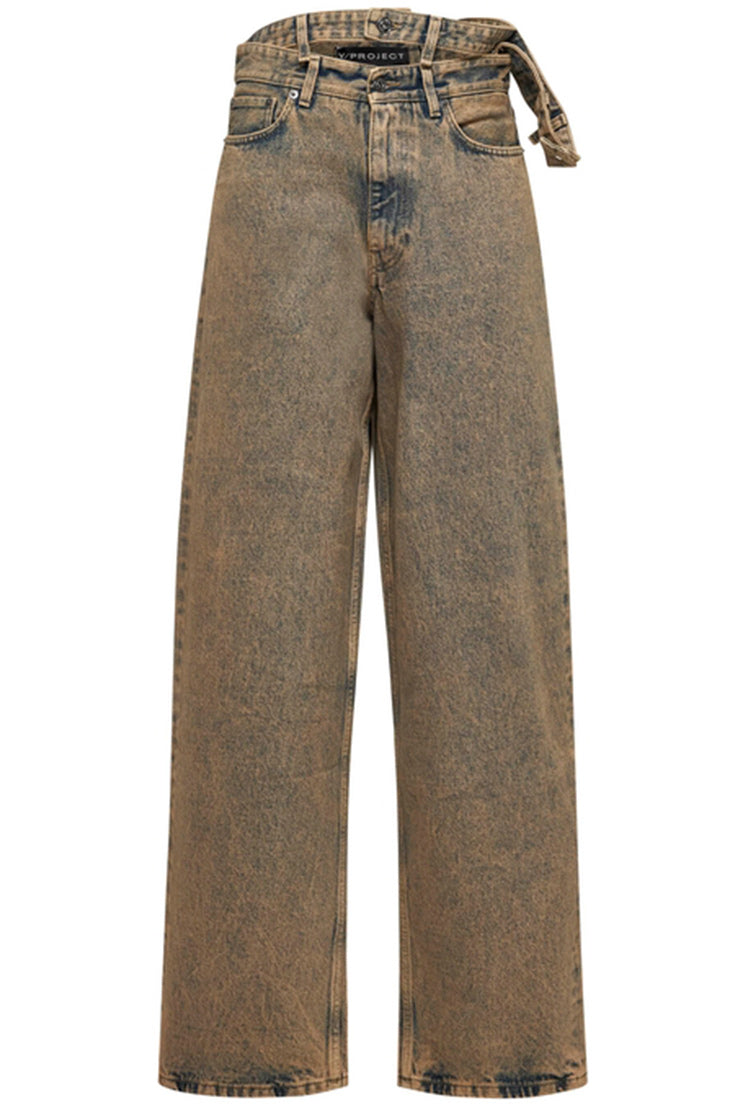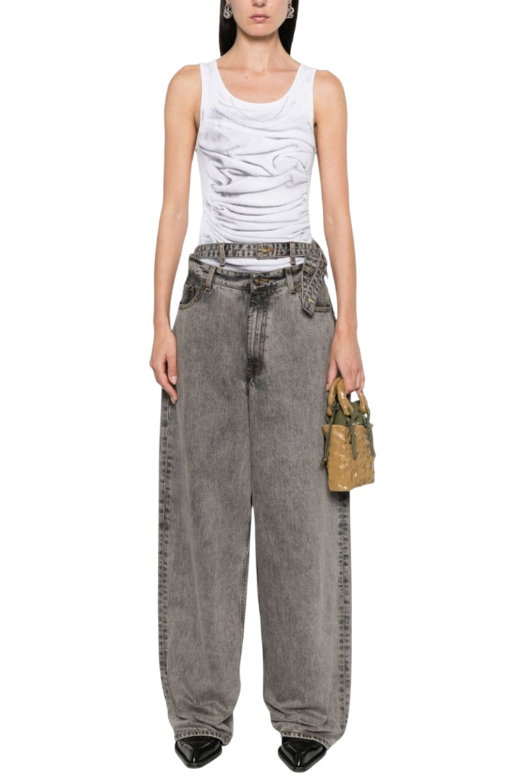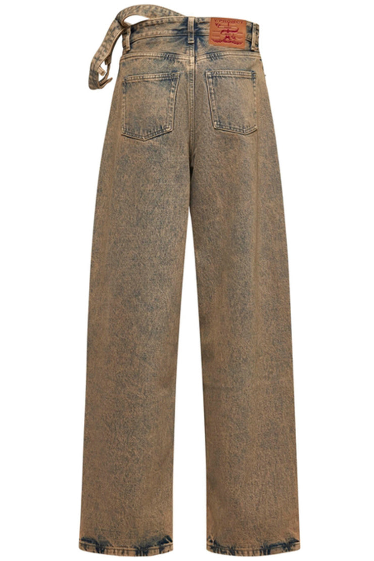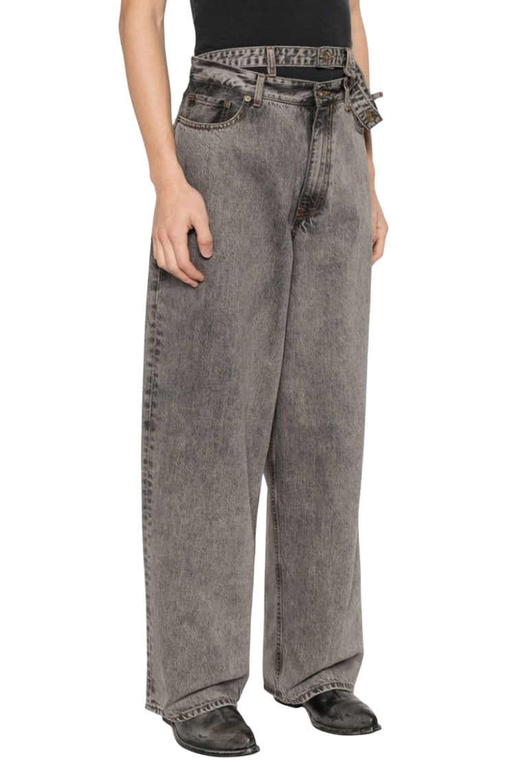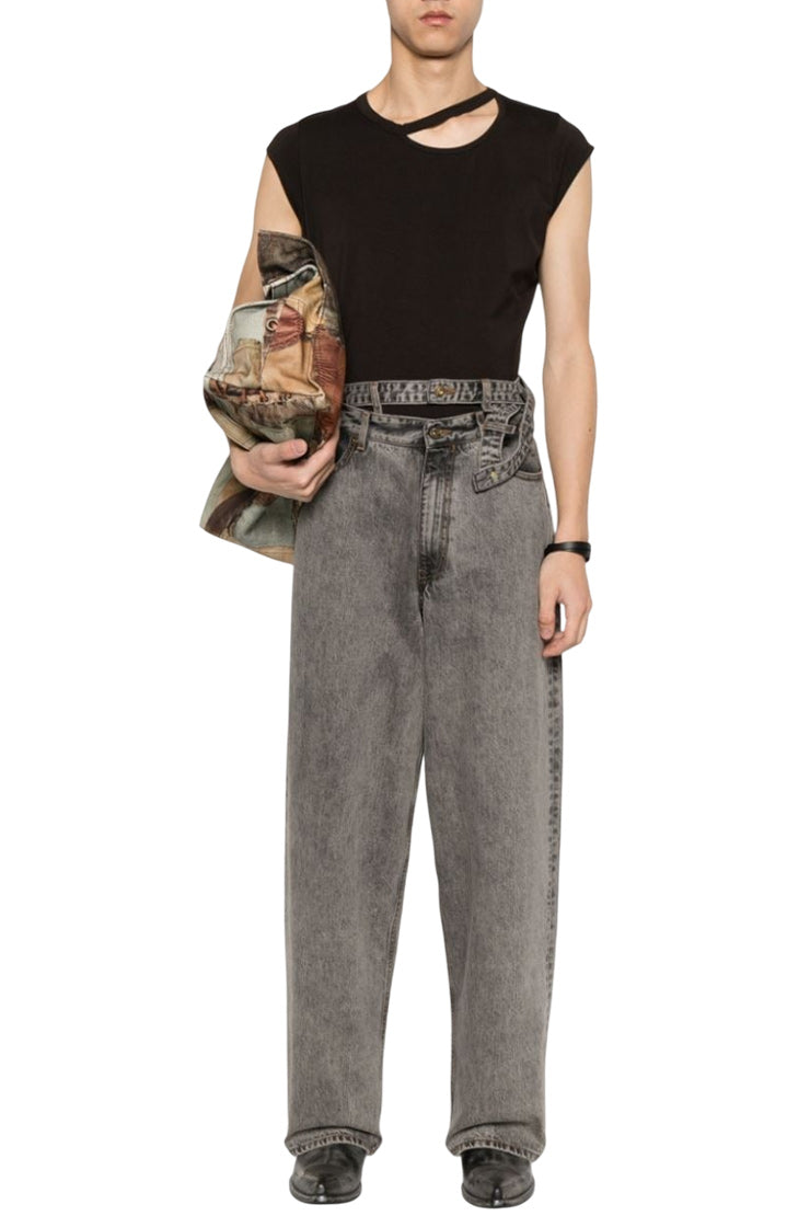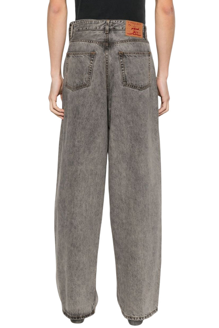 EVERGREEN LOOSE-FIT JEANS. Crafted in Italy from 100% cotton, these jeans feature a covered front closure, multiple asymmetric waistbands, and five functional pockets. A metal logo button at the front and a logo patch at the back add subtle detailing. The straight-leg design provides a refined, regular fit – perfect for effortless style and comfort.