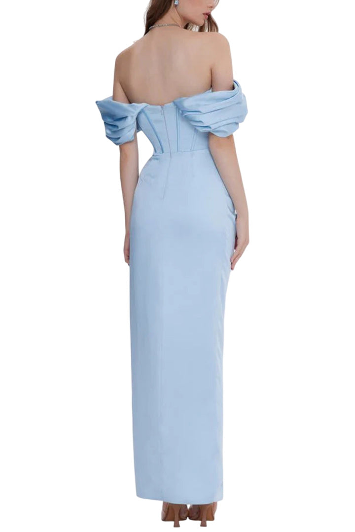 An off shoulder gown cut from lustrous satin and featuring a built-in corset.