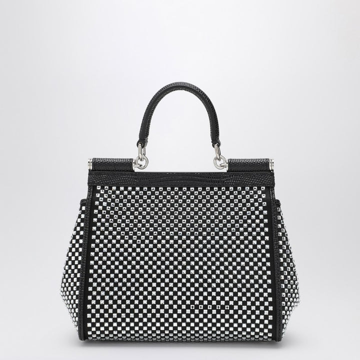 Dolce & Gabbana's sleek black leather medium handbag boasts a dazzling crystal-embellished exterior. A gold-toned frontal flap and hidden snap closure ensure secure and effortless access. Adjustable and removable shoulder straps offer versatility, while a label with the iconic logo adds a touch of sophistication. Inside, a zip pocket and phone slot provide practical storage, all set on metal feet for added protection.