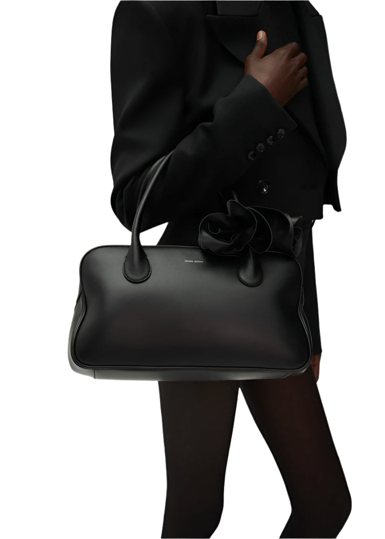 Meet the Brigitte handbag, a modern take on the 90s aesthetic infused with family heritage. Made in Italy, this timeless piece boasts a sleek silhouette, ample interior, and refined details like top handles and a secure zipper. Elegant leather flowers adorn the handle, adding a touch of whimsy. To complete the look, simply curl the petals outward for a beautiful blooming rose effect. Available in .