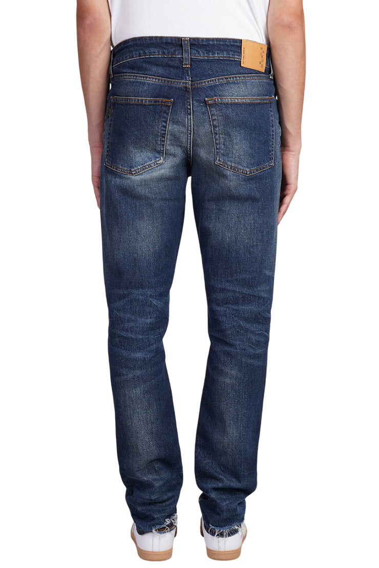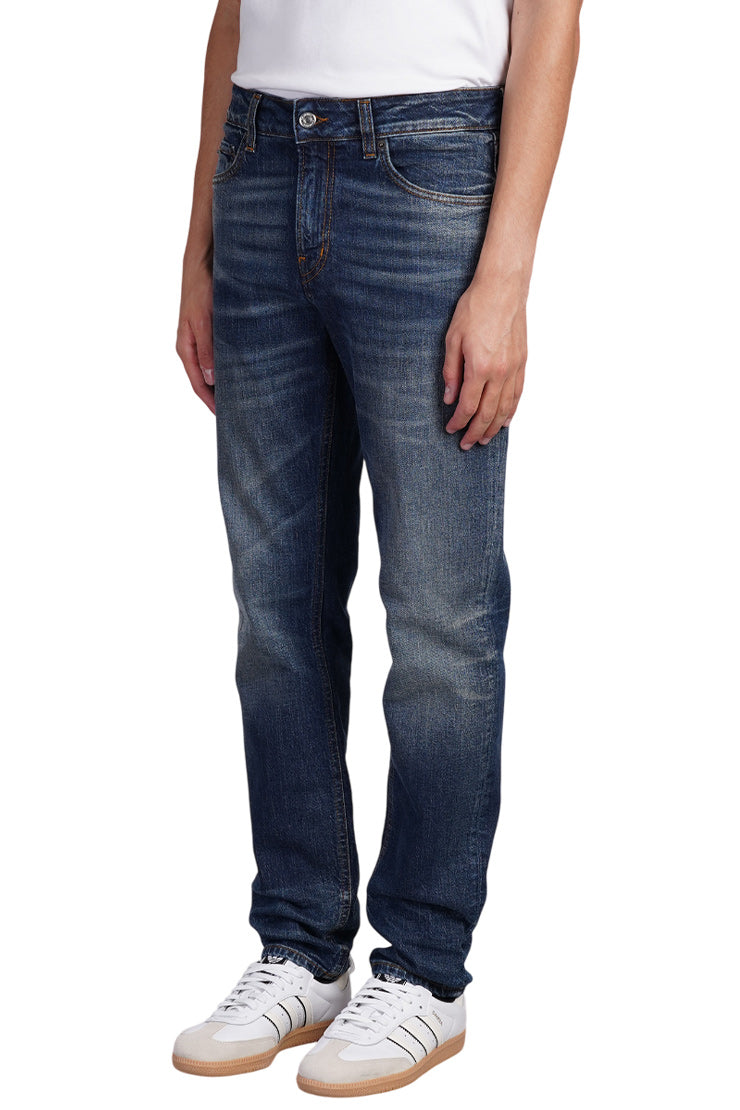 Crafted from stretch-cotton denim, these jeans showcase a subtle whiskering effect through contrast stitching. Classic details include five pockets and discreet belt loops. A concealed fly and button fastening ensure a sleek finish, while a rear logo patch adds a touch of understated style. The straight leg design provides a timeless look that's both refined and versatile.