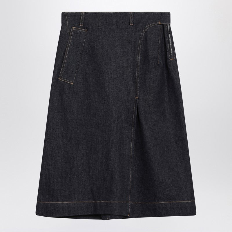 Dark blue cotton denim skirt from Victoria Beckham. Characterized by clean belt loops, visible stitching, and a logo patch, this design combines timeless style with modern details. Two functional back pockets and a slit at the back add a touch of sophistication. Made in Italy from high-quality cotton, this skirt is perfect for the modern woman seeking effortless elegance.