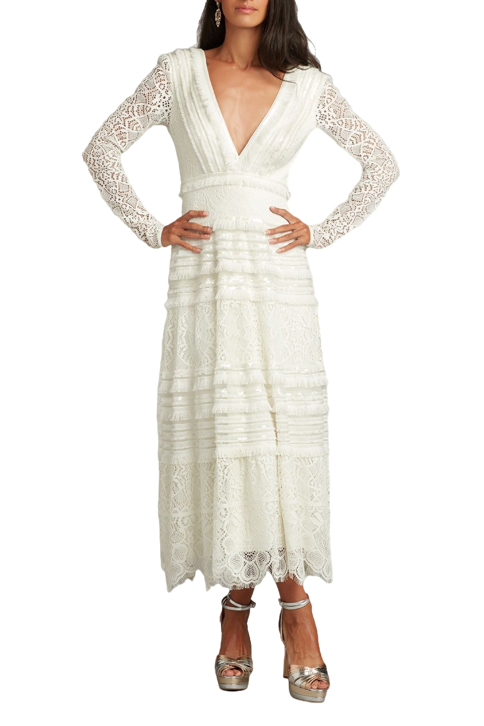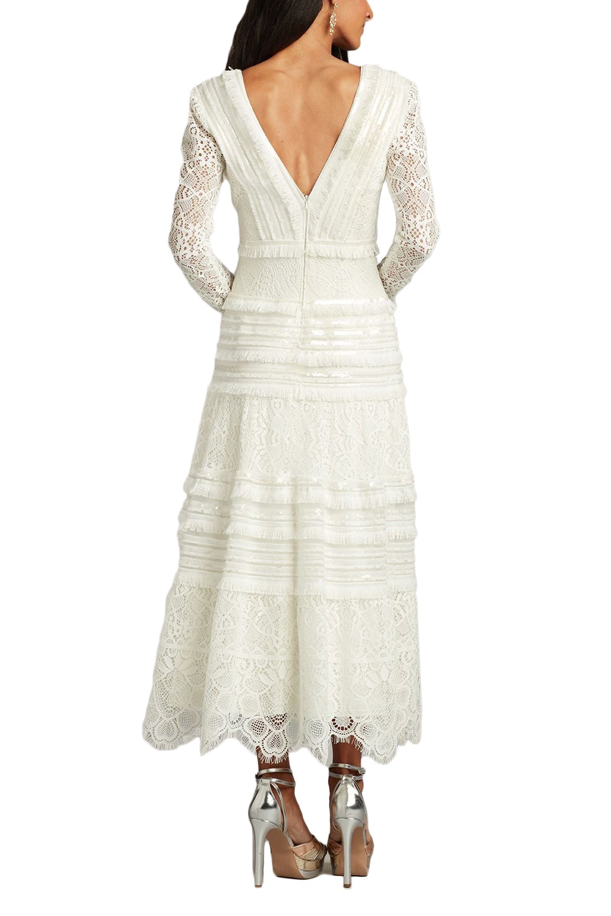 This timeless Tadashi dress features a v-cut neckline, long lace sleeves, and a flattering midi hemline.