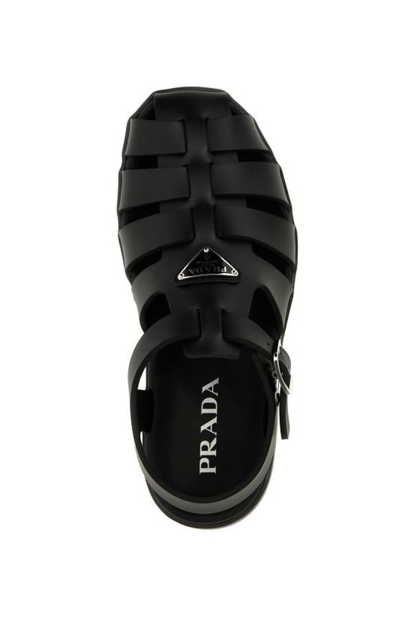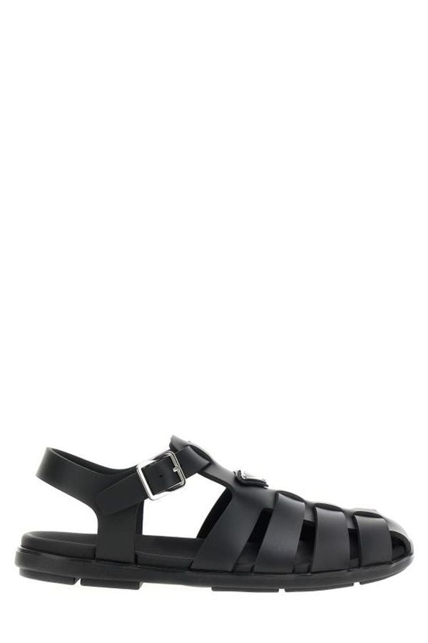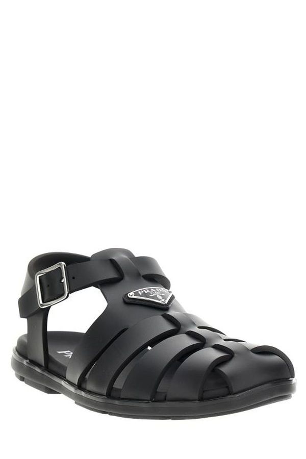 These black fisherman sandals feature a durable rubber cage design, highlighted by a front enamelled metal triangle logo. They include a secure buckled ankle strap and a slingback strap for added support, all set on a sturdy rubber sole.