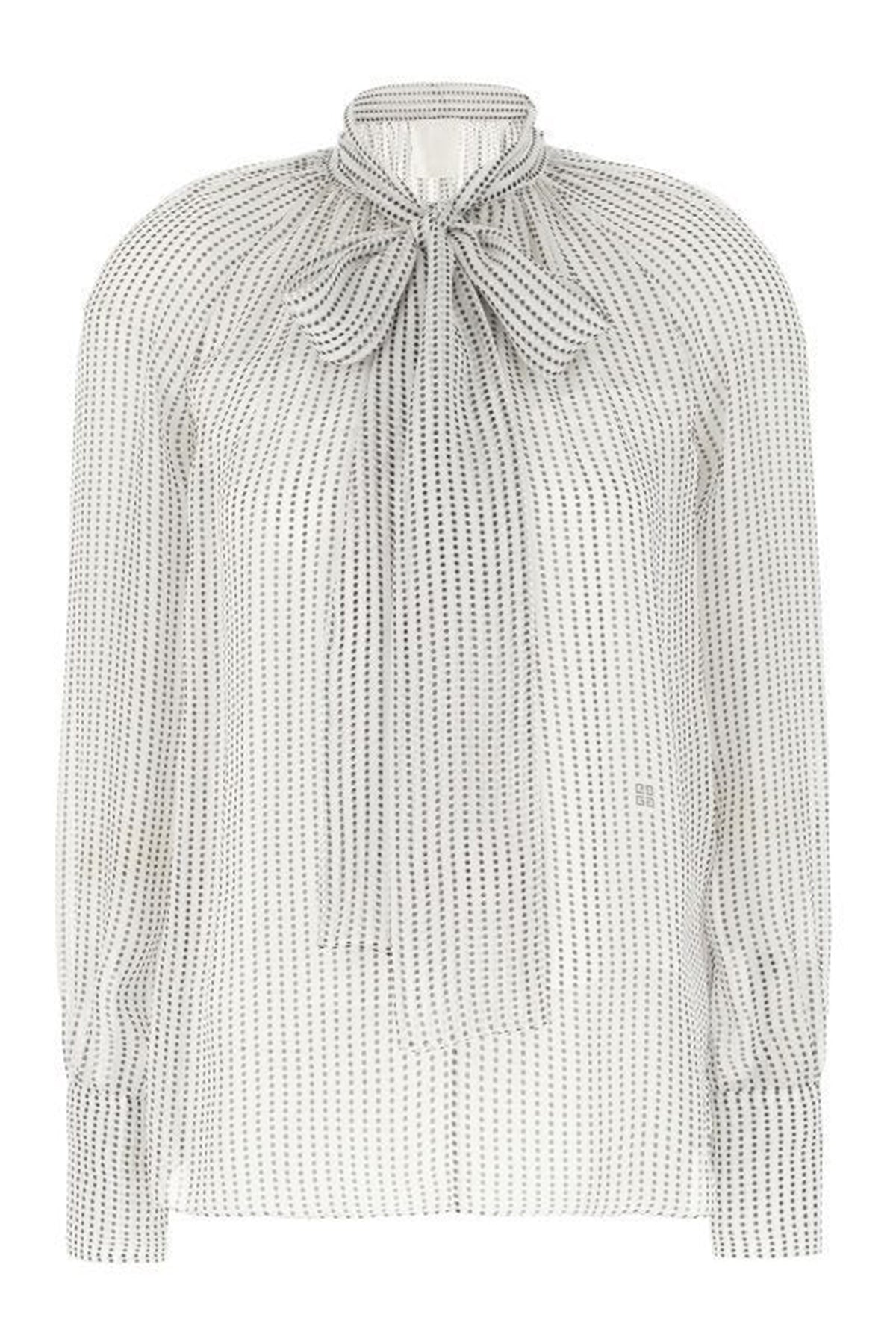 Our silk chiffon blouse boasts a high-neck design, elevated by a delicate lavallière detail. Subtle polka dots dance across the fabric, punctuated by a discreet 4G emblem. A strategically placed slit at the neckline adds a touch of femininity, while buttoned cuffs and a silky lining ensure a comfortable, refined fit.